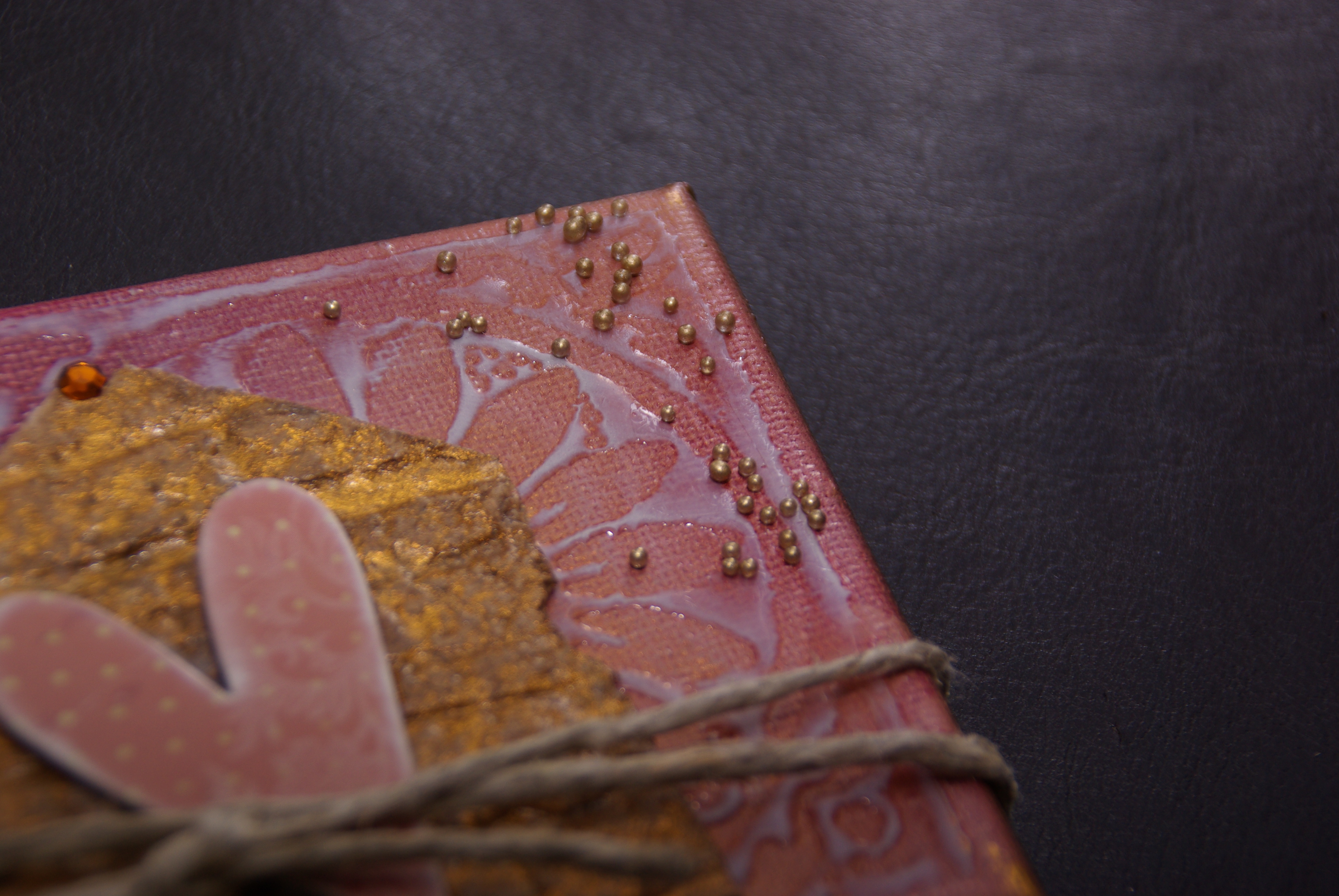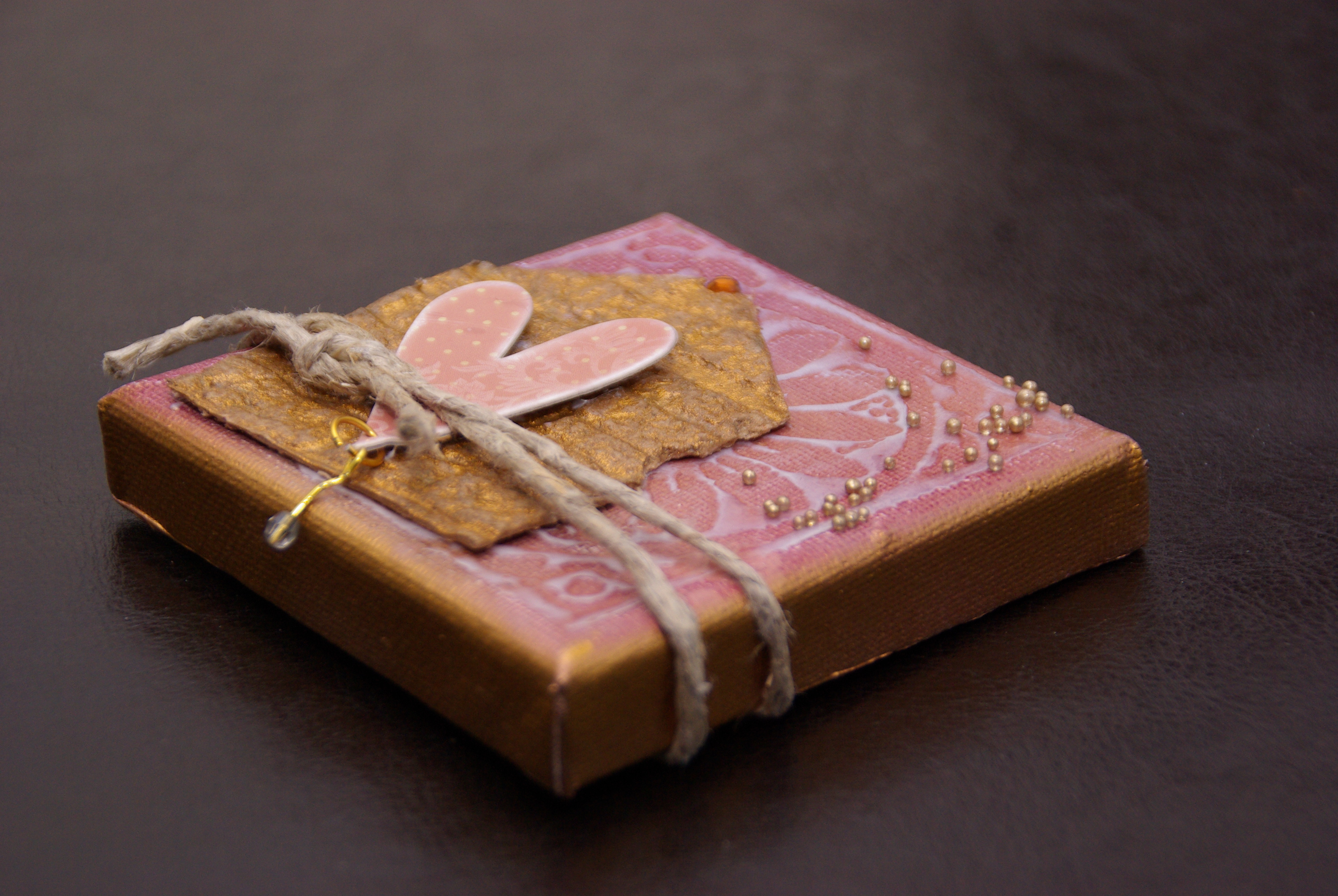 Het is een minicanvas, bespoten met drie kleuren spraypaint. Stempel erop met UTEE en glazen pareltjes. Het huisje is van eierdozen gemaakt en gerold over een embossing geval om baksteentjes effect te krijgen. Bespoten met goudverf. Het hartje kant en klaar van Kruidvat en touw om alles bij elkaar te houden (Cynthia bedankt voor het idee!!!)