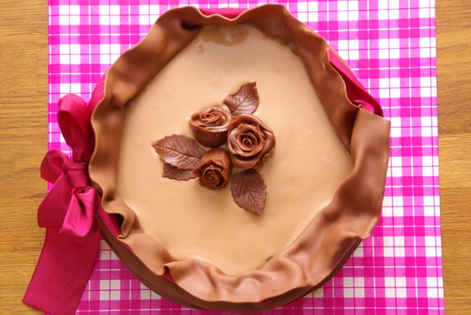 Ik heb een chocoladeganache gemaakt om over de taart te gieten, dat zag er op zich waanzinnig uit, maar de zijkanten werden toch niet zo mooi. Maar ik had ook nog kneedbare belgische chocola, waar ik bloemen van wilde maken, dus heb ik dat ook maar gebruikt voor de zijkanten, het werd een soort chocoladetas, dus ik vond die strik er wel bij horen….een paar chocoladebloemen in het midden en klaar……ik vind trouwens de “chocolate leather” (kneedbare chocolade) prima te verwerken, ik had er nog niet mee gewerkt maar ook nog niet echt positieve berichten over gelezen, maar ik vind het echt helemaal geweldig….