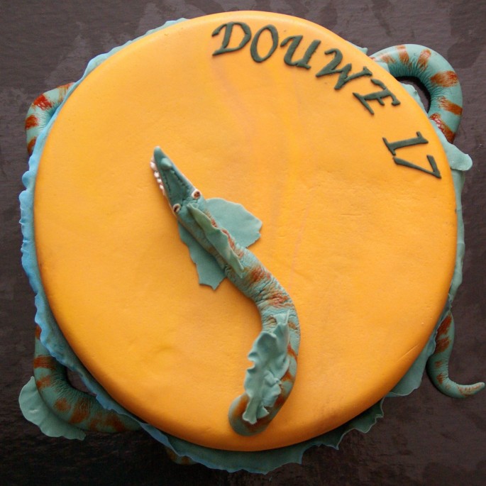 De tweede taart was een scifi/robin hobb taart. Nog nooit van gehoord, maar lang leve google!!! Het zijn fantasy verhalen en ik heb de cover van een van de boeken als basis genomen. Het idee van een zeeslang vond ik wel gaaf. De kleuren vond ik ook onwijs…..dus het betere mengwerk, altijd leuk!
