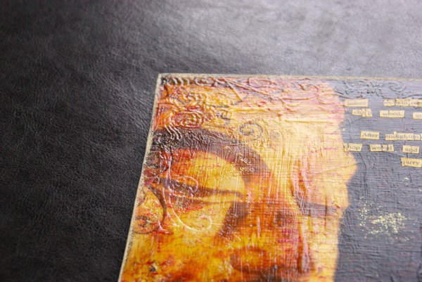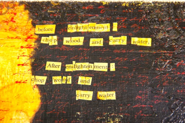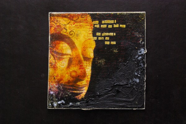 Dat is een Zen-quote en wel eentje die ik voor Channie&Co moest verwerken. Op zich wel heel mooi, maar met Zen en Buddha heb ik op zich helemaal niks. Toch had ik meteen een idee en ging ik op internet op zoek naar een plaatje van een Zen-Buddha…..vond deze erg mooi en dus verwerkt. Lekker beetje geknutseld met rub-ons, glasparels, stukje gaas, embossingpoeder en nog wat frutsels…….de quote heb ik uit een engels boek bij elkaar gezocht…..ben zelf best blij met het resultaat….