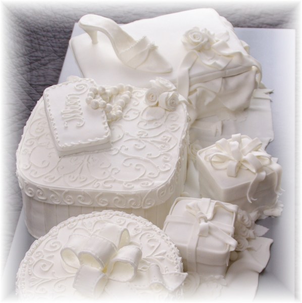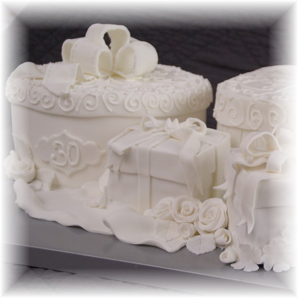 Of ik haar nog een keer wilde helpen. Thema was “Totally White” voor iemand die 30 jaar wordt. Leef je maar uit. Als het maar chocoladetaart is en helemaal wit afgewerkt. Ooooh wat is dat toch lastig. Zeventig personen? Mijn hemel, dat wordt een flinke stapeltaart……maar ik moest de taart wel bezorgen zelf, dat ga ik nooit durven, een enorme stapel in mijn auto! Dus wat dan…..in de breedte werken maar wat? Even onder mijn neus wrijven…… ik heb het!!!!!!! Dit idee heb ik ooit eens gezien ergens op het www rond kerstmis, allemaal kerstkadootjes bij elkaar. Dat kan natuurlijk ook met gewone kadootjes.