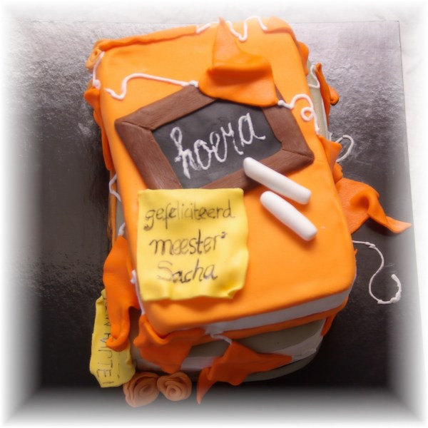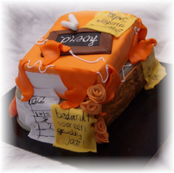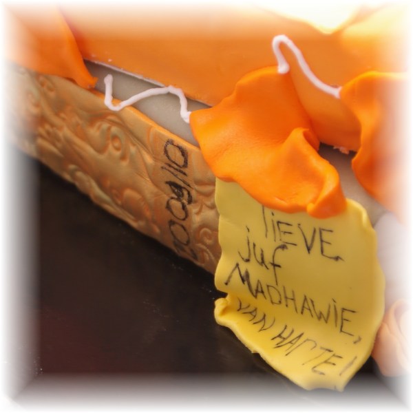 Een oranje boekentaart voor het verjaardagsfeestje van Phaidra’s meester en hulpjuf, gevuld met mandarijntjes swiss merenquecreme en mandarijntjes: