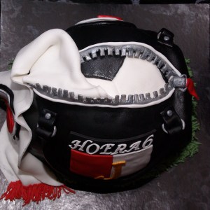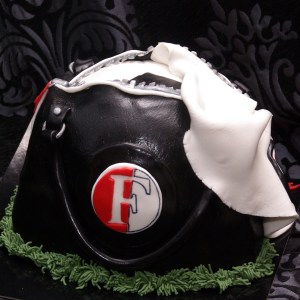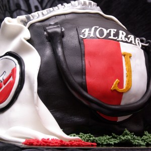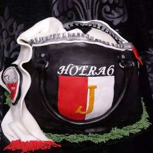 FEYENOORDTASVERJAARDAGSTAART!!!!! Toch??? Een “echte” Feyenoordtas met een voetbal “erin” en een supporterssjaaltje. Cake is gewone witte cake, eigenlijk is het een stapeltaart, maar dat zie je natuurlijk verder niet, de onderste taart is gevuld met kersenvlaaivulling en marshmellowvanillecreme, het bovenste stuk met bokkepootjesslagroom. Ik heb dat vaker gemaakt met botercreme, maar met slagroom is het wat luchtiger en lichter. En ik vind het zelfs NOG lekkerder…. (ja ik proef alles voor, zo hoort het toch?;-))