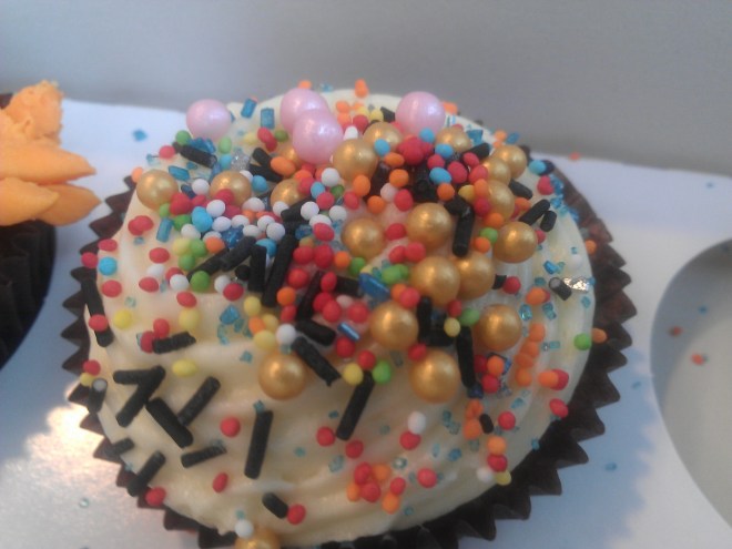 De andere twee cupcakes had ik thuis al opgespoten met een witte chocoganache toef en ik had heel veel soorten strooisels meegenomen, dus dat was een echt feestje!