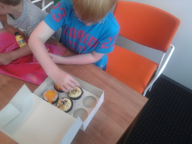 Groep 1/2 van het tangram had keuzemiddag. Ouders gaan dan met een groepje kinderen aan de slag. Met mij mochten ze cupcakes versieren.