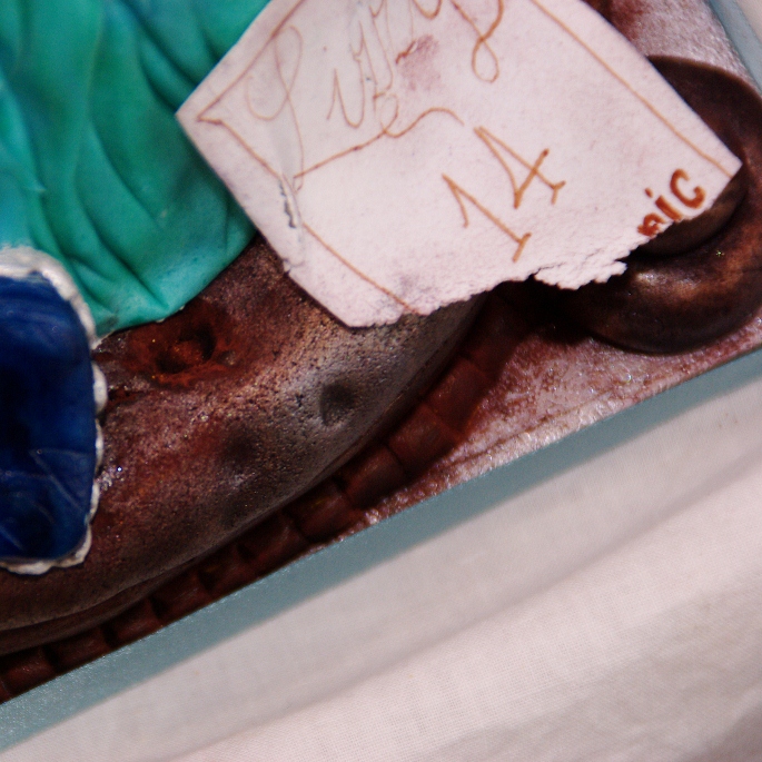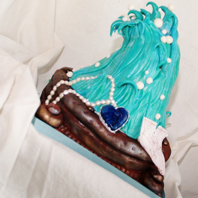 Lizzy is helemaal gek van de film Titanic. Moeder vond het daarom een geweldig idee om haar te verrassen met een Titanic taart. Wel iets met het sierraad erop, the Heart of the Ocean. Verder mocht ik me uitleven, en dat is natuurlijk altijd het leukste! Ik wilde toch “iets” van de Titanic zelf erop, dus een beetje vergane patrijspoort waaruit het water “spuit”, natuurlijk allemaal van cake, gevuld met jam en banketbakkersroom.
