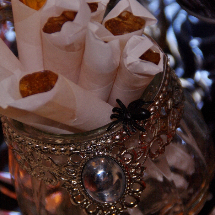 Een wat???? Ja, geen sweet table dus, want op deze tafel staan ook een heleboel hartige en gezonde hapjes…. maar wel allemaal in Halloween thema en met een kleurenschema in zwart, rood en oranje. Erg leuk om te doen, vooral het bij elkaar zoeken van flessen drinken… juiste kleur dop, juiste kleur drinken…. gelukkig nog een paar heel toepasselijke blikjes ook… want ook alcoholische versnaperingen ontbreken niet op deze tafel… een heel volwassen tafel dus!