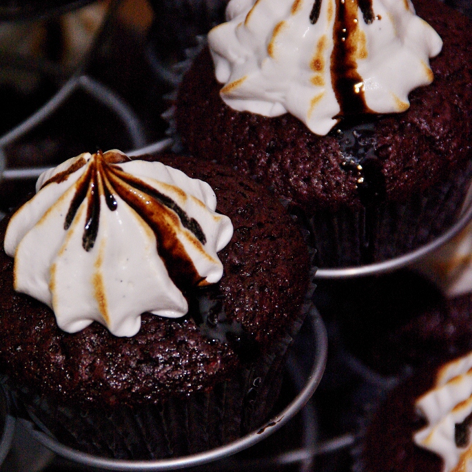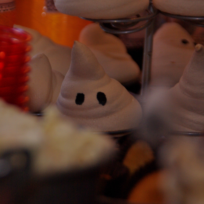 De cupcakes waren chocolate mud cupcakes met een toefje van zachte vanillemeringue, bewerkt met de creme brulee brander en met wat druppels vanille balsamico…. De “spookjes” zijn pavlovaschuimpjes uit de oven, nog heerlijk “zacht” van binnen…. zo’n beetje taai zeg maar… lekker!