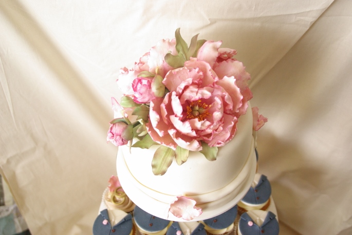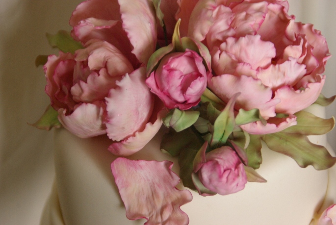De tweede taart met pioenrozen was een aansnijtaartje bij een set cupcakes. Bovenop het aansnijtaartje wilde het bruidspaar suikerwerk pioenen, heel wat bewerkelijker dan verse bloemen! Het bloemwerk heeft een week gekost, tussendoor moet er steeds een gedeelte drogen, het kleuren kost tijd en netjes in elkaar zetten natuurlijk. Dit vergt dus wel wat planning. En doorzettingsvermogen, want na blaadje zoveel wordt het tóch een beetje gevangeniswerk haha. Ik had namelijk ook nog blaadjes gemaakt voor de cupcakes.