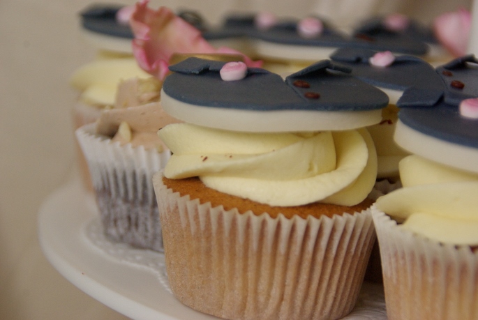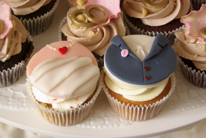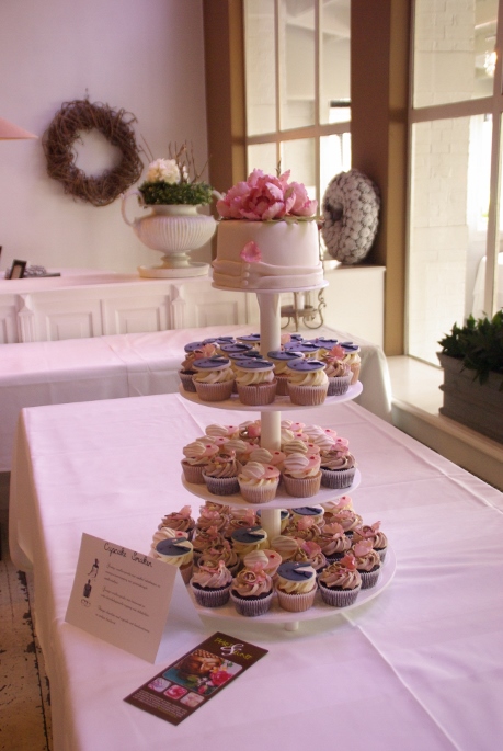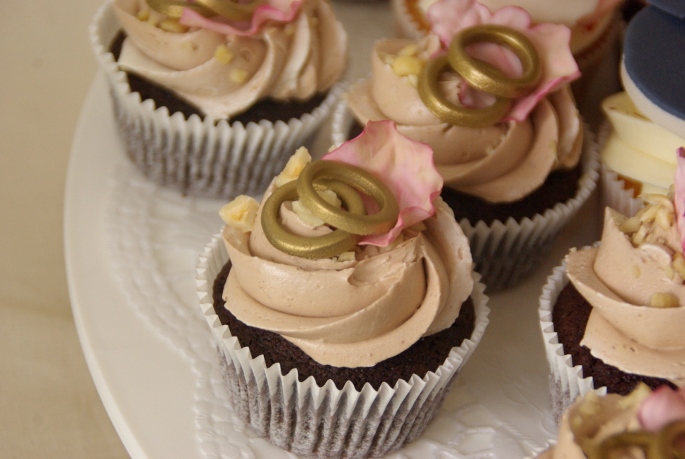 Bezorgen mochten we deze taart in Zuidland, bij hotel Blessing, echt werkelijk een prachtige locatie! Aan een oud en romantisch dorpsplein waar we voor de deur konden parkeren en waar de ceremoniemeester ons met een paraplu stond op te wachten, geweldig geregeld! Gelukkig was het net op dat moment even droog, is toch gezelliger. Er was al een tafel klaargezet waar we de cupcakestandaard konden gaan opbouwen. Dit hadden we al een keer “proef” gedaan om te zien hoe het zou passen en wat een mooie verdeling zou zijn, dus dat was zo gebeurd. Het taartje bovenop en een kaartje erbij gezet met de smaken van de cupcakes. Want die waren best bijzonder: lemoncurd/witte ganache met chilivlokjes, aardbeirabarberjam/meringuecreme met gevriesdroogde aardbeitjes en chocolatemud cupcakes met hazelnootcreme met stukjes hazelnoot.