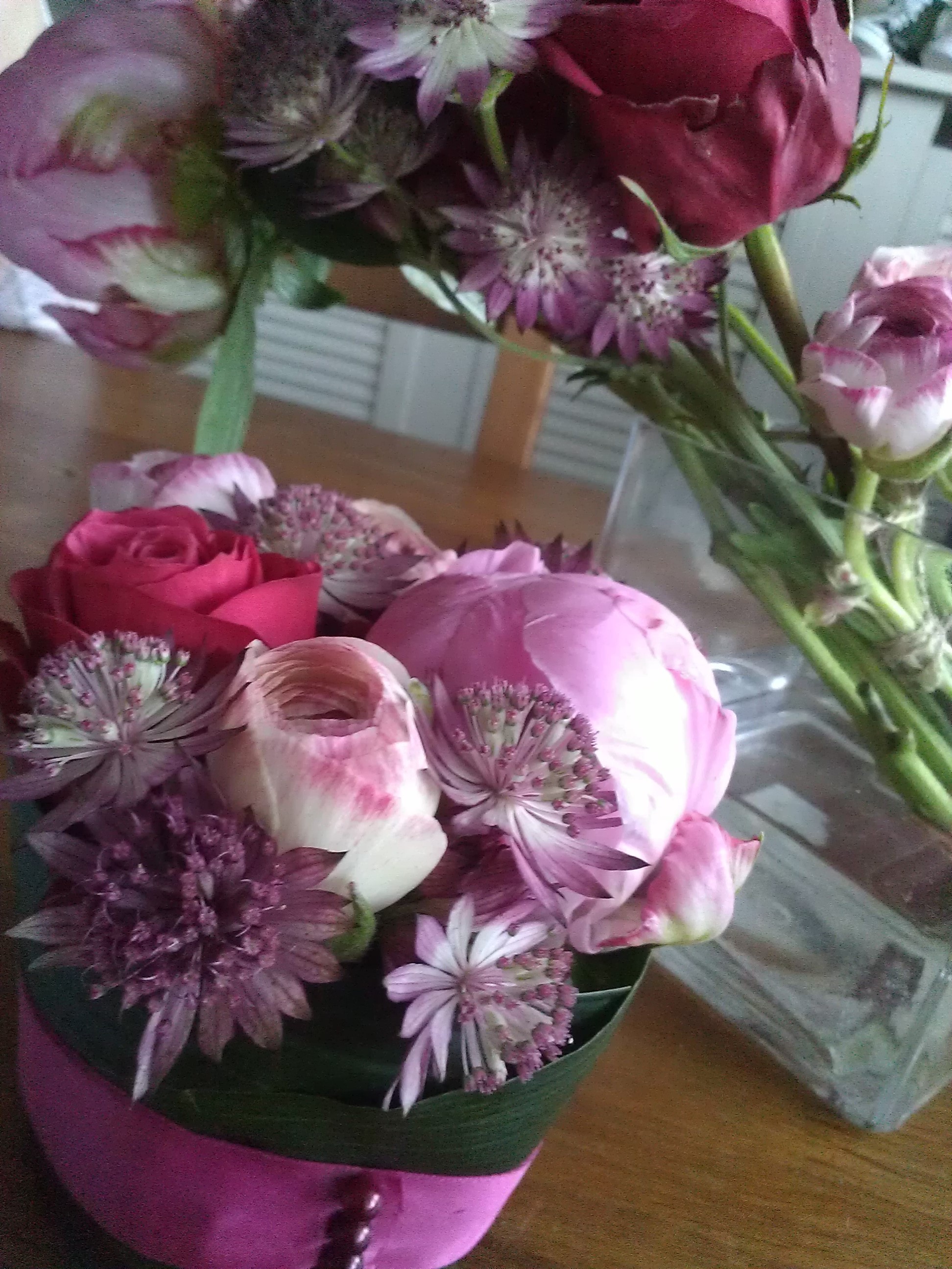 Ik heb de bloemen en blaadjes zo bij elkaar op draad gezet, dat het twee losse stukken werden, die bovenop het taartje in elkaar pasten.