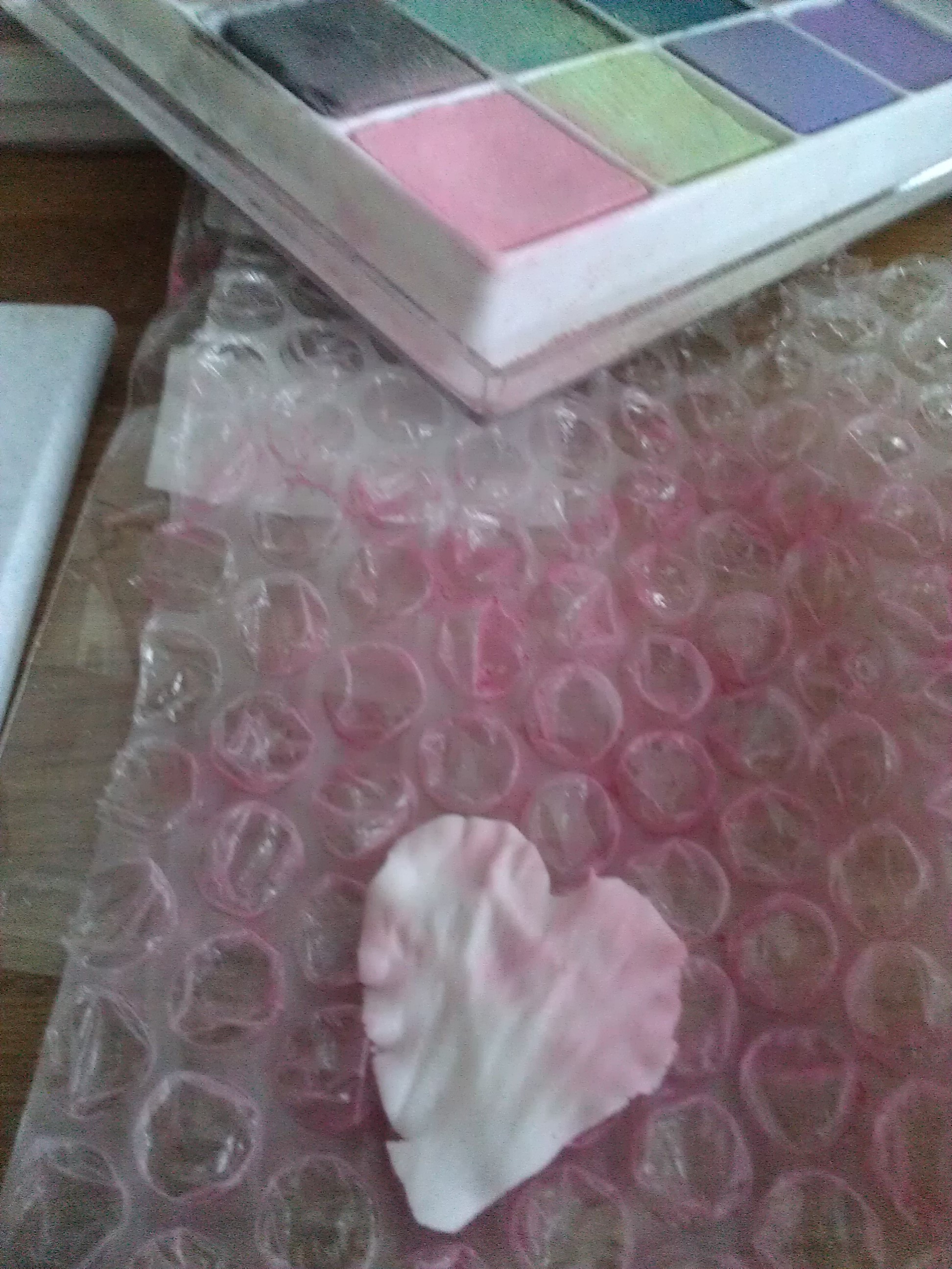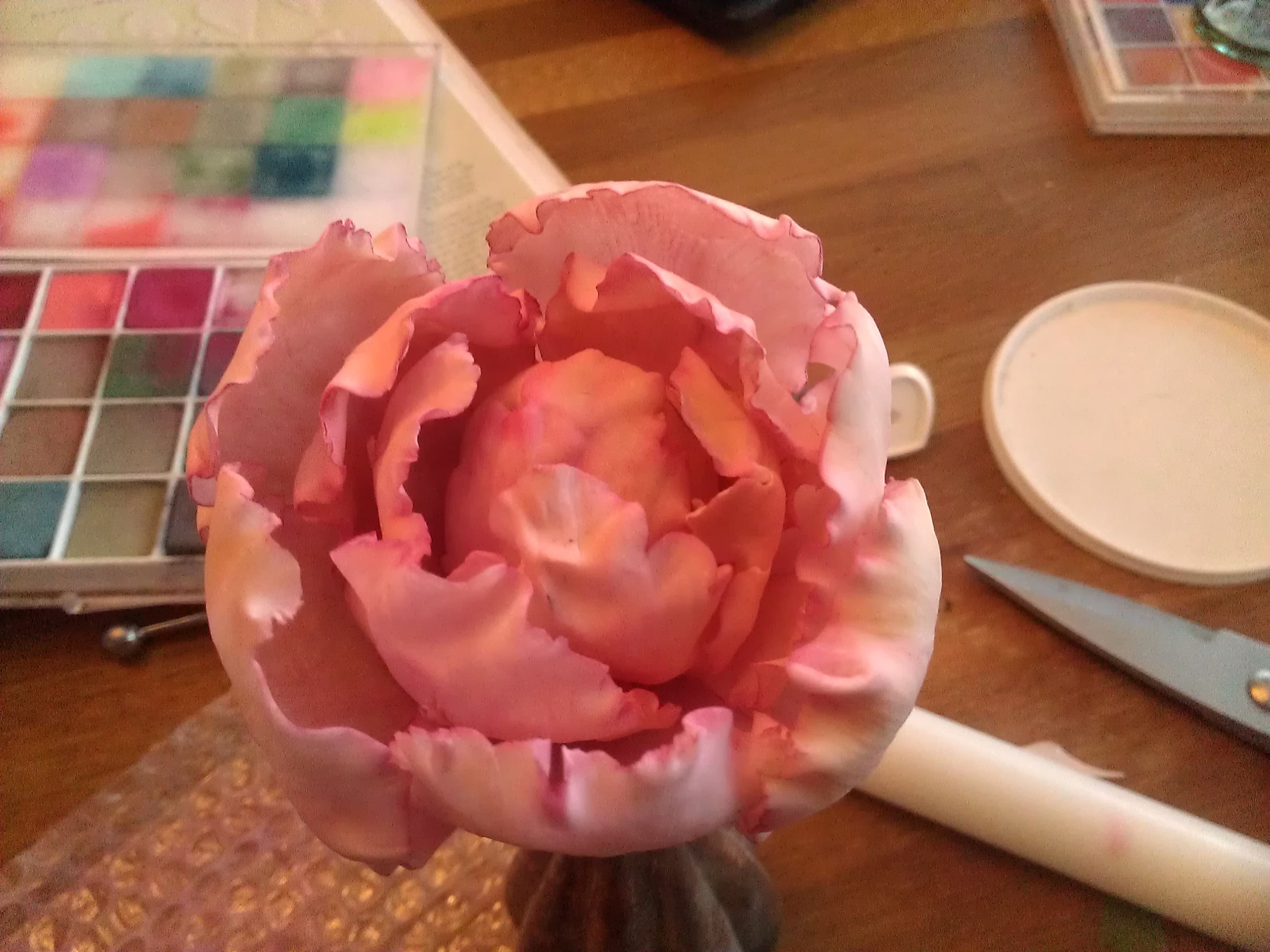 Kleuren is met een aantal kleuren roze en paars en een aantal kleuren groen gedaan, allemaal uit mijn “dustjesdoos”. Voor de open pioen heb ik stampertjes gebruikt, die zijn dus níet eetbaar, maar de rest allemaal wel!