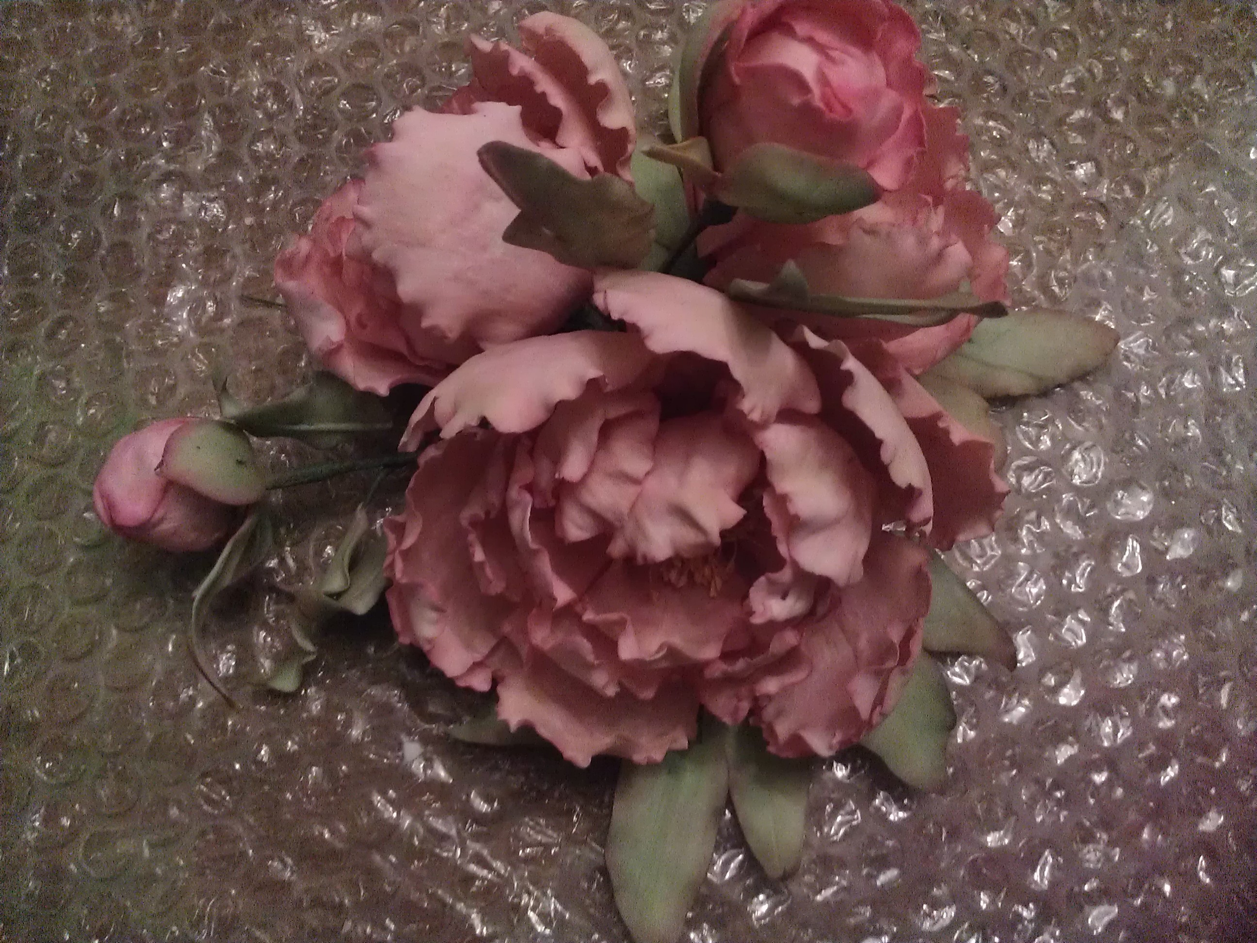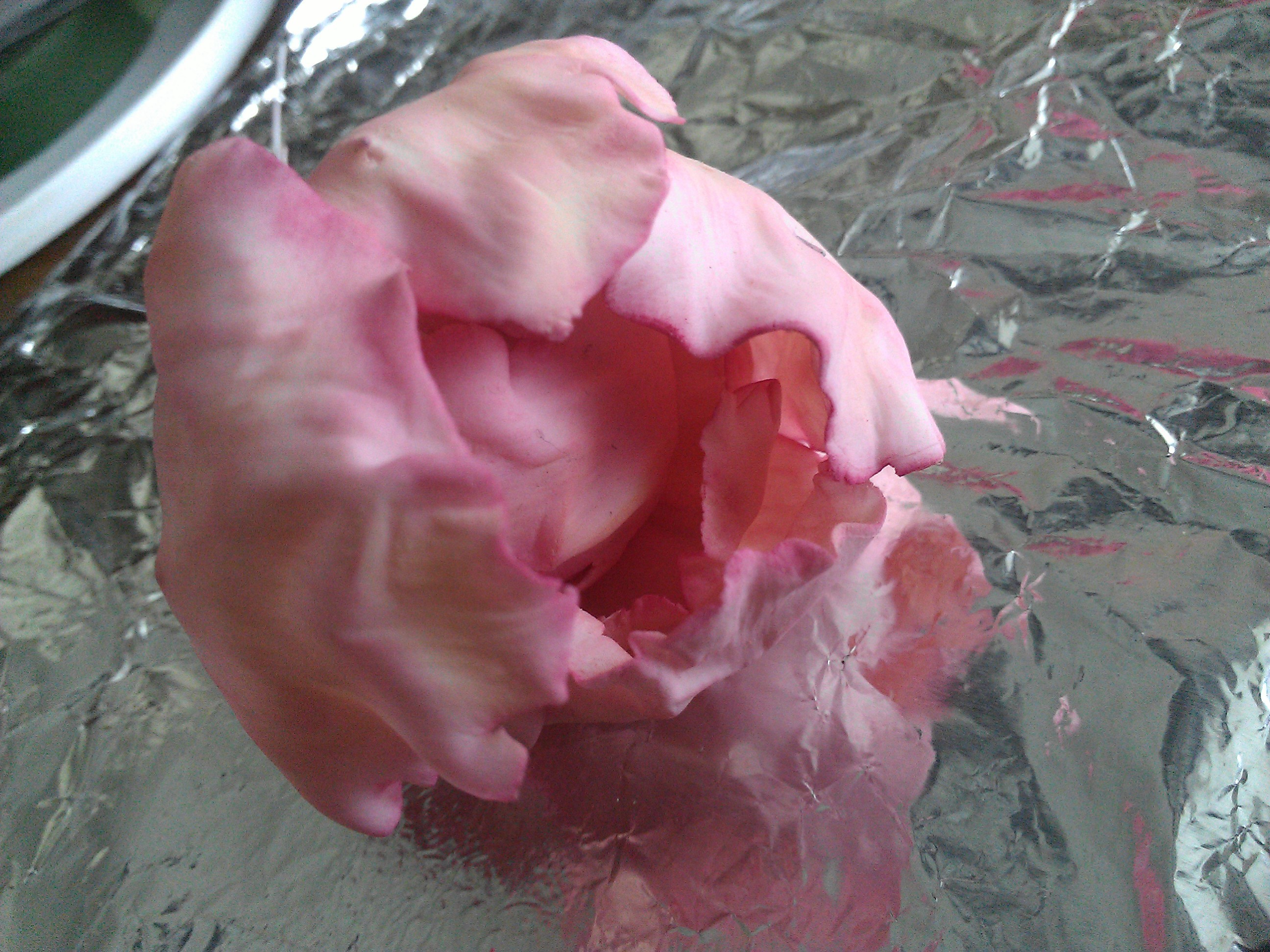 Voor deze pioenen heb ik gumpaste van SatinIce gebruikt, voor dit fijne werk is dat erg prettig “spul”. Je kunt het heel dun verwerken zonder dat het stukgaat. Omdat het snel droogt, is het wel handig om niet teveel blaadjes tegelijk te snijden en de blaadjes die je nog moet bewerken onder plastic te bewaren. Ik heb de blaadjes gewoon zelf uitgesneden, maar een aantal zijn met een orchidee uitsteker gedaan, beetje variatie in soort blaadjes dus. Met een grote balltool de randen nog dunner gemaakt en toen de blaadjes in een speciale siliconenmal voorzien van de kreukels en nerfjes. En dan dus even laten drogen, zodat die kreukels, de ronding en nerfjes er ook in blijven.