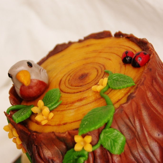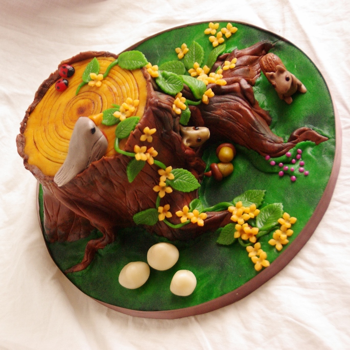 Ik heb een stevige vanillecake gebruikt voor de boom, en voor de “wortels” heb ik dezelfde cake gebruikt, maar dan met merenguecreme tot een deeg gekneed, zodat ik de wortels mooi kon vormen. De taart is gevuld met een ganache van Belgische chocolade en daar is de taart ook mee afgesmeerd.