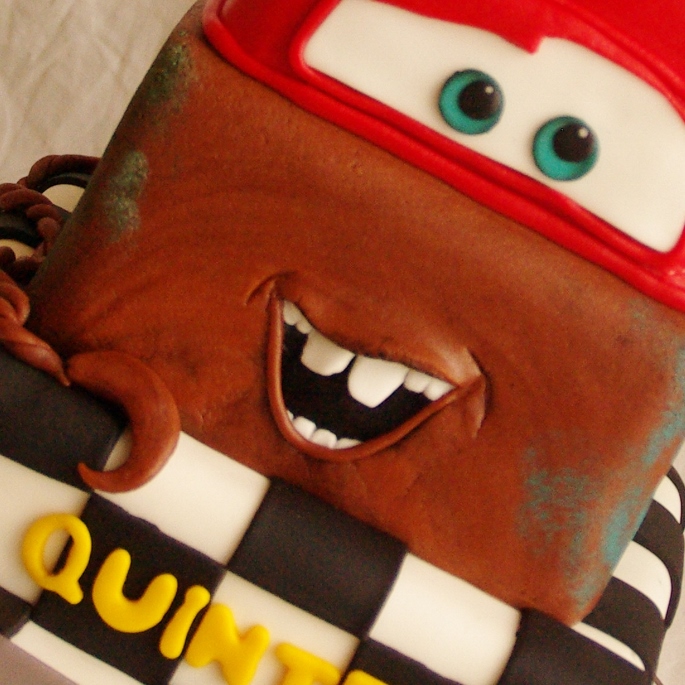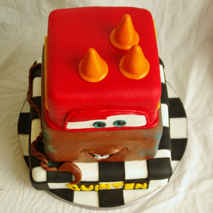 Gisteren mocht ik een Cars taart afleveren. Daar heb ik er natuurlijk al best een heleboel van gemaakt en aangezien ik de vrije hand kreeg ik wilde ik eens “iets anders”. Ik had dit idee al eens voorbij zien komen (neeeee ik ben niet erg origineel, maar met Cars is het al gauw niet origineel) en ik vond het erg leuk.