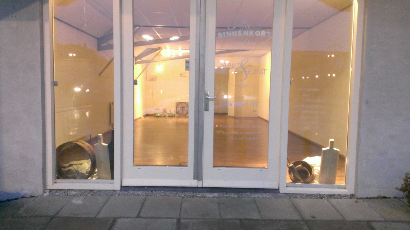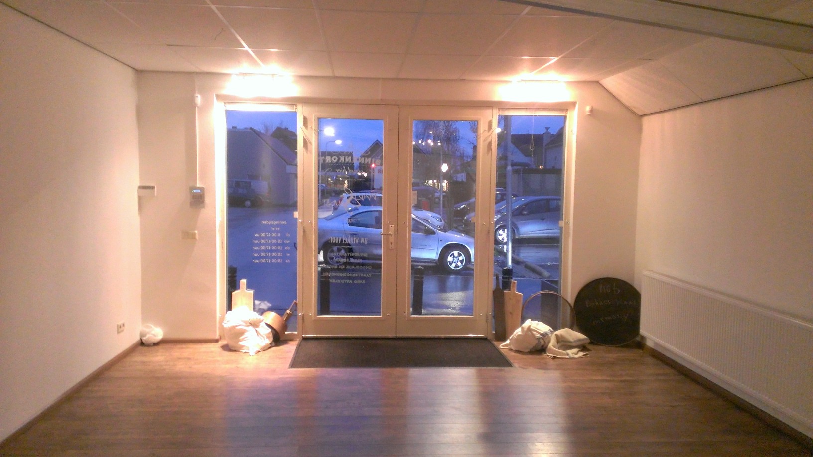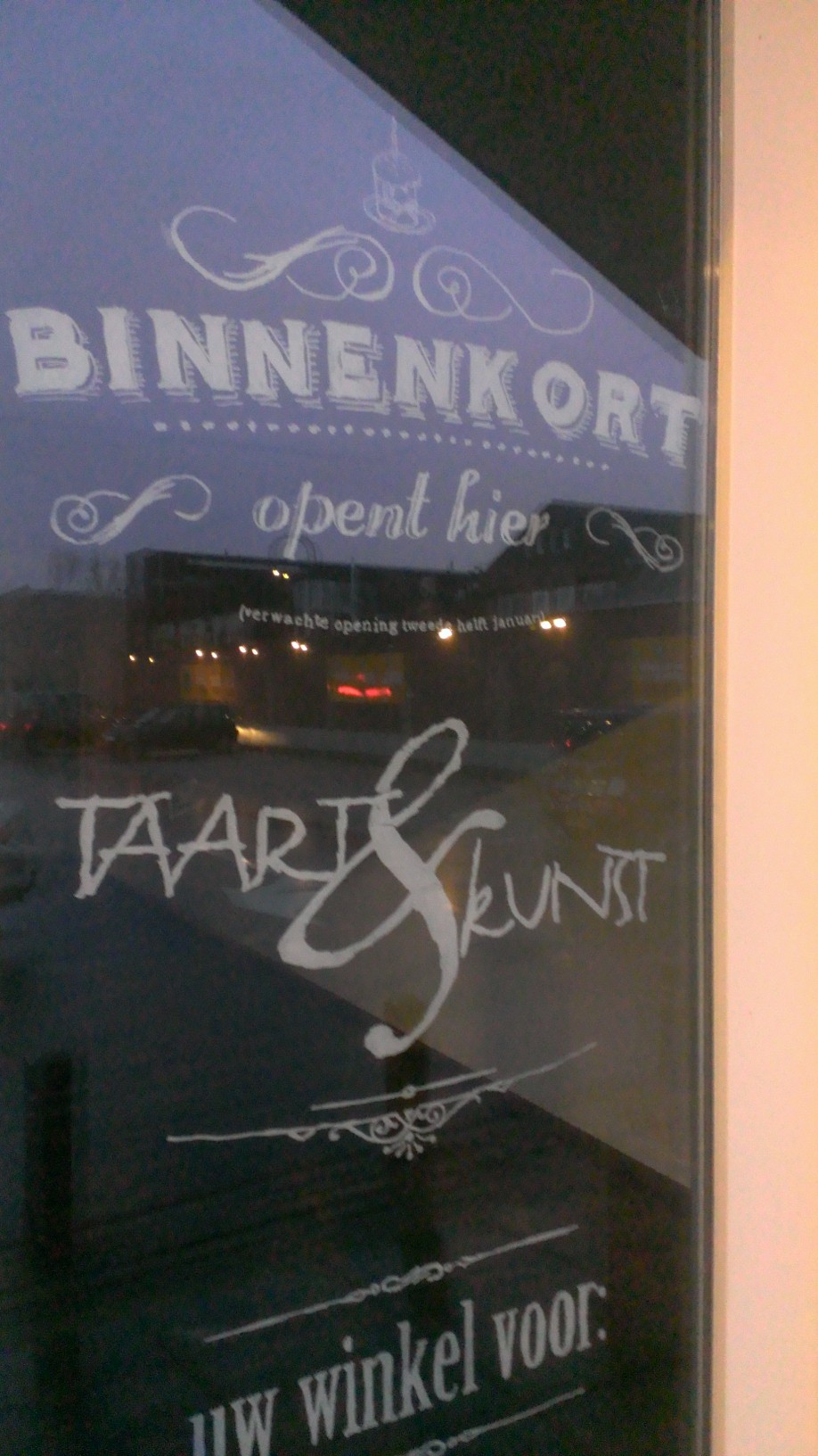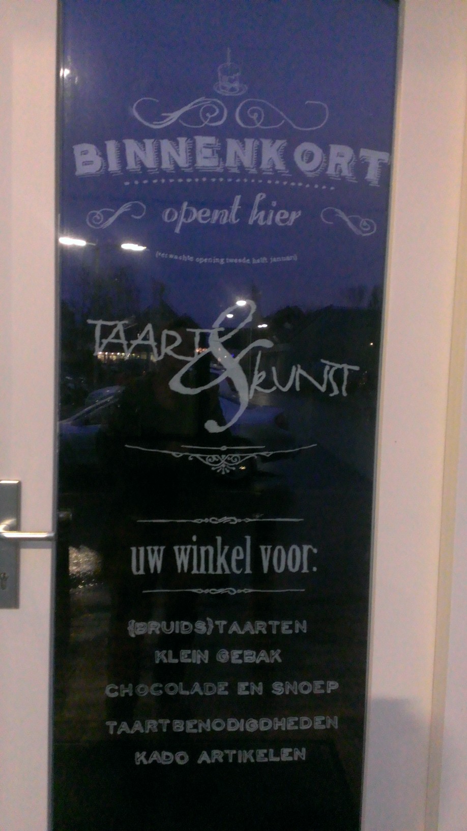 Vandaag werd ik gebeld…. of ik alvast de sleutel van de winkel wilde. Nou daar hoefde ik natuurlijk niet over na te denken, dat wilde ik wel. Meteen naar Zevenhuizen gereden met wat spullen, ook met krijtstiften om een tekst op de deur te maken. Ik had in photoshop al een tekst gemaakt en uitgeprint of ware grootte.