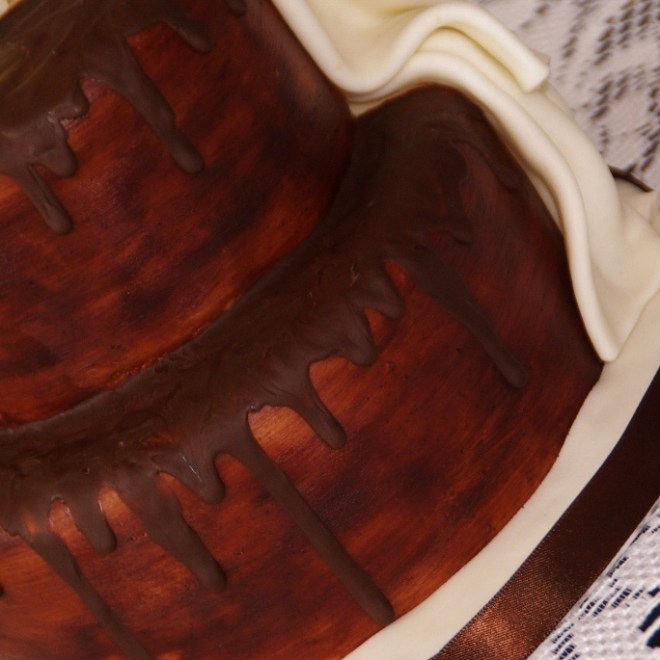 Dus het werd een klein stapeltje, een rijke chocolate mudcake gevuld en afgesmeerd met een ganache van belgische witte chocolade. De “bruidegomkant” is geverfd met cacao en daarover nog wat gesmolten chocoladedruipers 😉