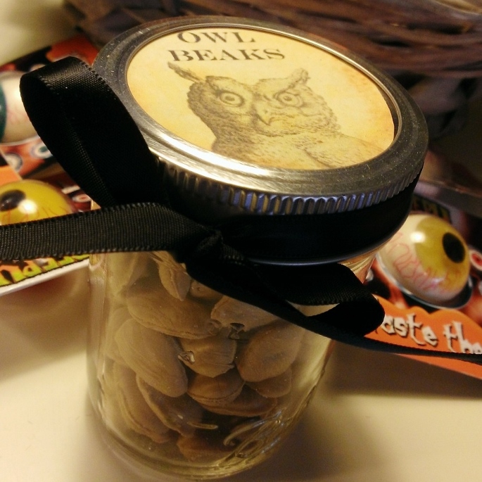 We hebben heerlijke oogballen, van zacht snoepschuim… in diverse smerige kleuren 😉 Maar ook hebben een aantal heksen wat snoepgoed uit onze kast omgetoverd tot bijvoorbeeld “mensentenen” en “vollemaanstof”.