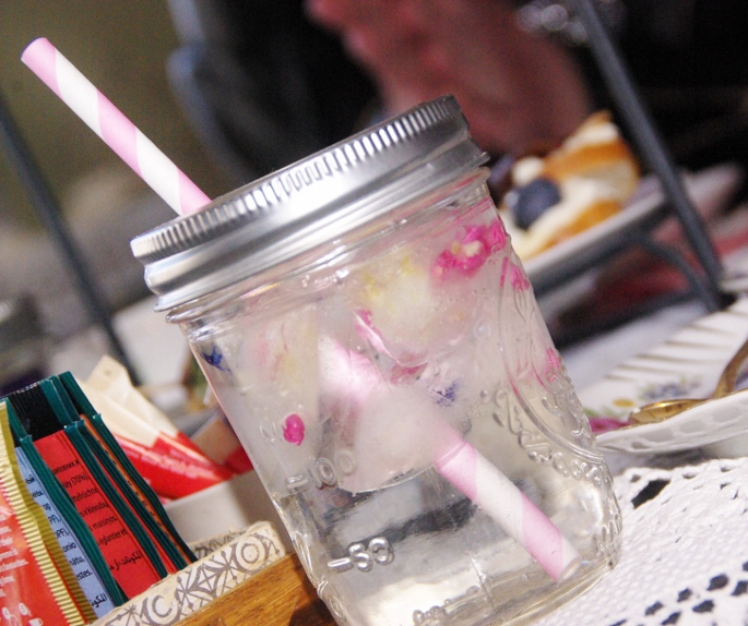 Hierbij hoort natuurlijk thee, onbeperkt genieten van diverse verrassende smaken, maar natuurlijk ook de traditionele “Earl Grey”. Als verfrissing staat er ook nog een glaasje koud water op tafel met bloemenijsblokjes (eetbare bloemen).