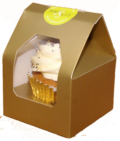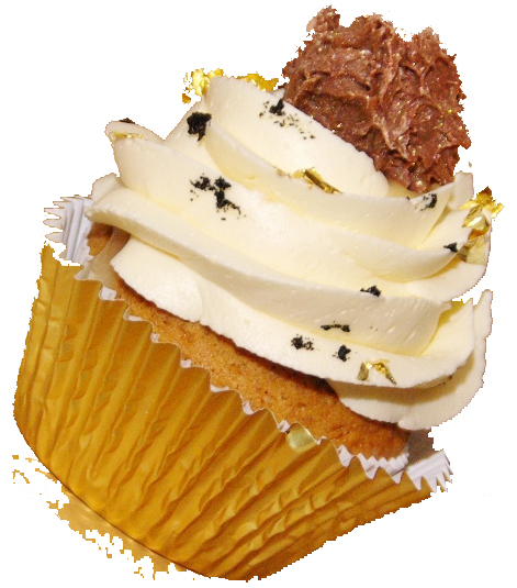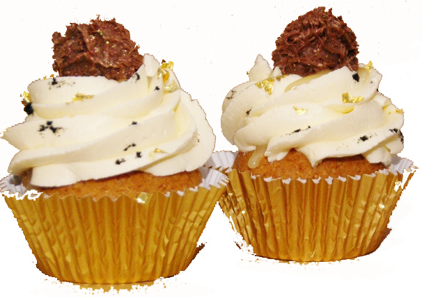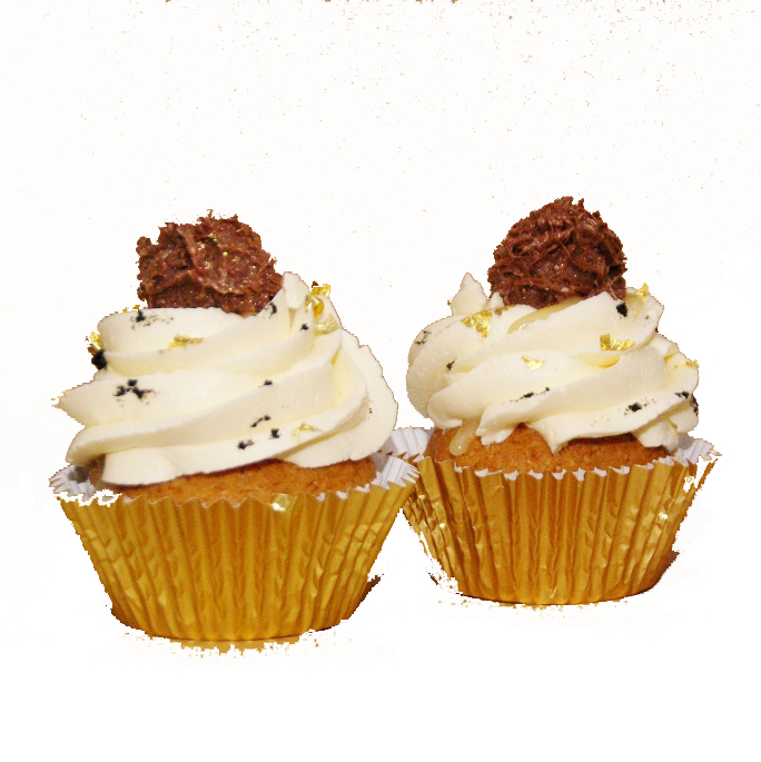 Een heerlijke vanillecupcake, gevuld met een dot smeerbare marsepein (de smaak van duur, met witte truffel, vanille en bladgoud!), een toef van meringuecreme met Golden Syrup, versierd met echt bladgoud, vanillezaadjes en met bovenop die prachtige shiny chocoladetruffel met saffraanvulling…..