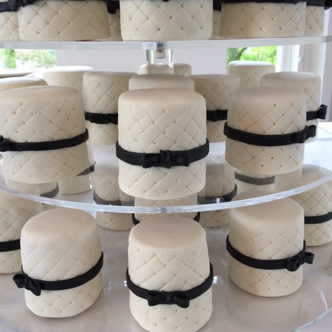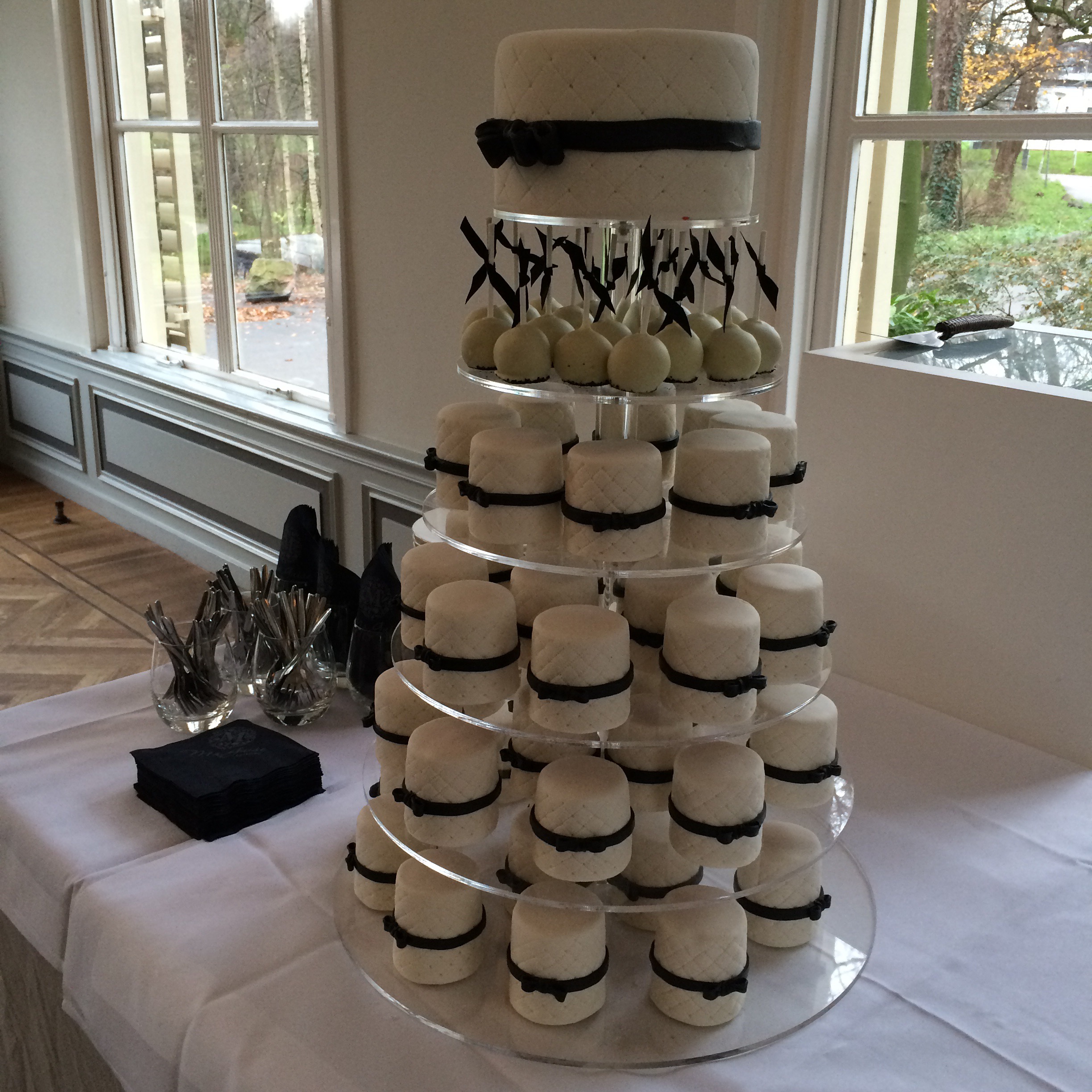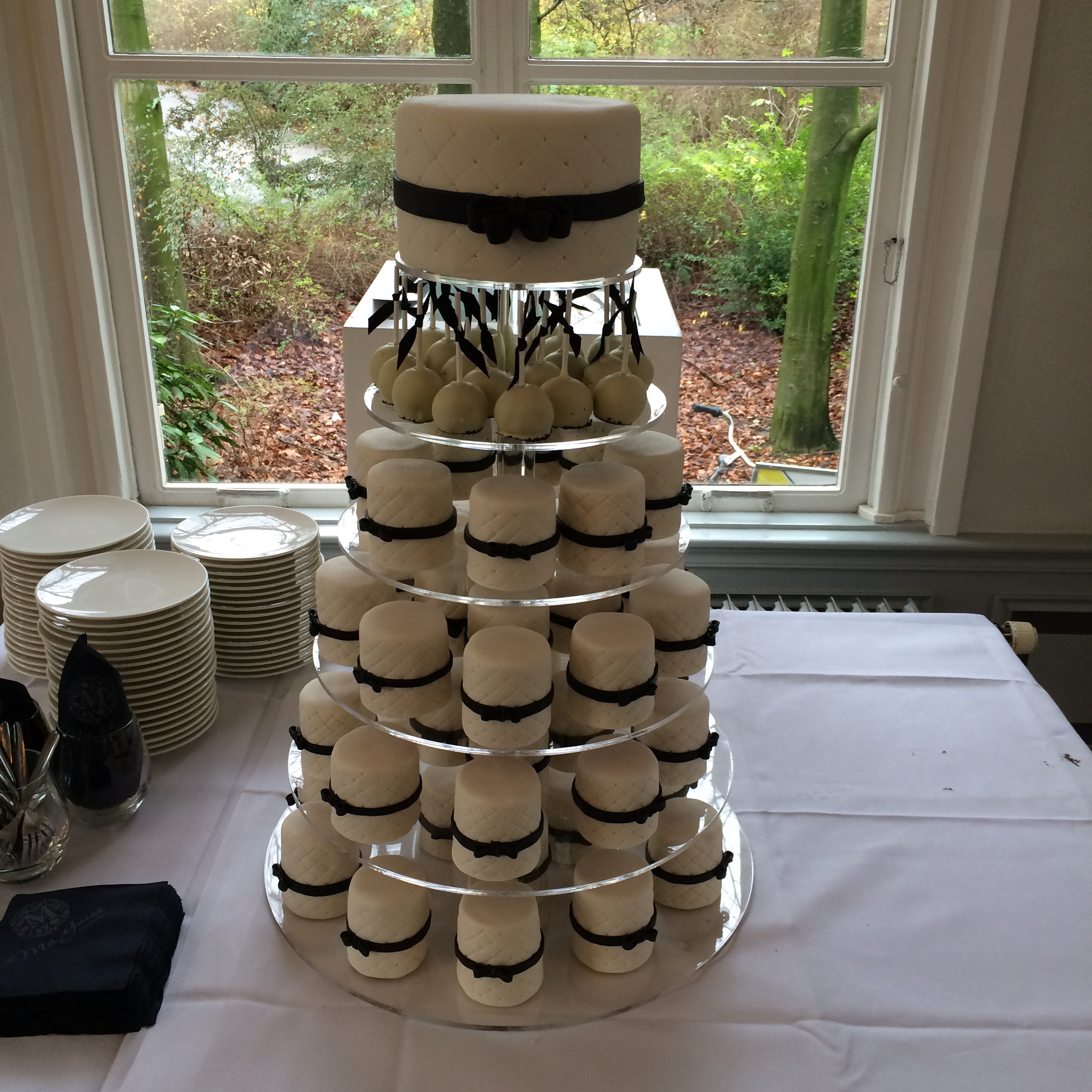 Een toren vol mini red velvet bruidstaartjes met marsepeinen strikjes en een aansnijtaart er bovenop. Bovendien nog een aantal red velvet cakepops.