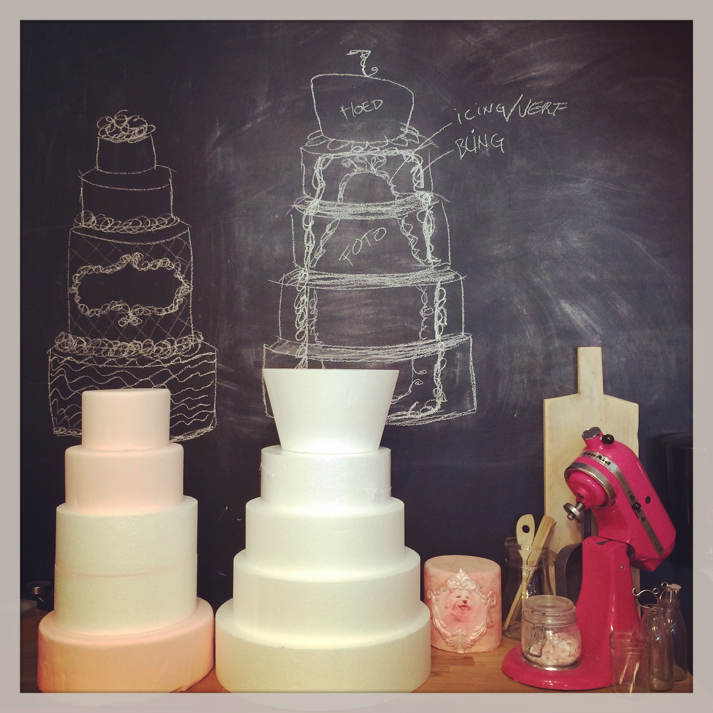 En toen begon het harde werken voor mij. Schetsen uitwerken, dummies op maat snijden (leuk joh, dat piepschuim!) en natuurlijk het bekleden en decoreren. Omdat het in de winkel en met de “gewone” opdrachten erg druk was, vooral de afgelopen week met de Paastaartjes en -pakketten heb ik veel ’s avonds en ’s ochtends heul vroeg gebuffeld. Eerste Paasdag de hele dag aan het werk geweest en ook Tweede Paasdag nog, tot rond 11 uur de dummies werden opgehaald. Eenmaal aangekomen in Brasschaat bleek er wat schade te zijn aan 1 van de dummies…. ow jee… gelukkig viel het mee en wat fijn dat deze de volgende dag teruggebracht werd… ik had ondertussen al reserveonderdelen klaar liggen daardoor was het snel gefikst. Met extra reserveonderdelen en handschoentjes, icing en wat advies ging het weer richting Brasschaat.