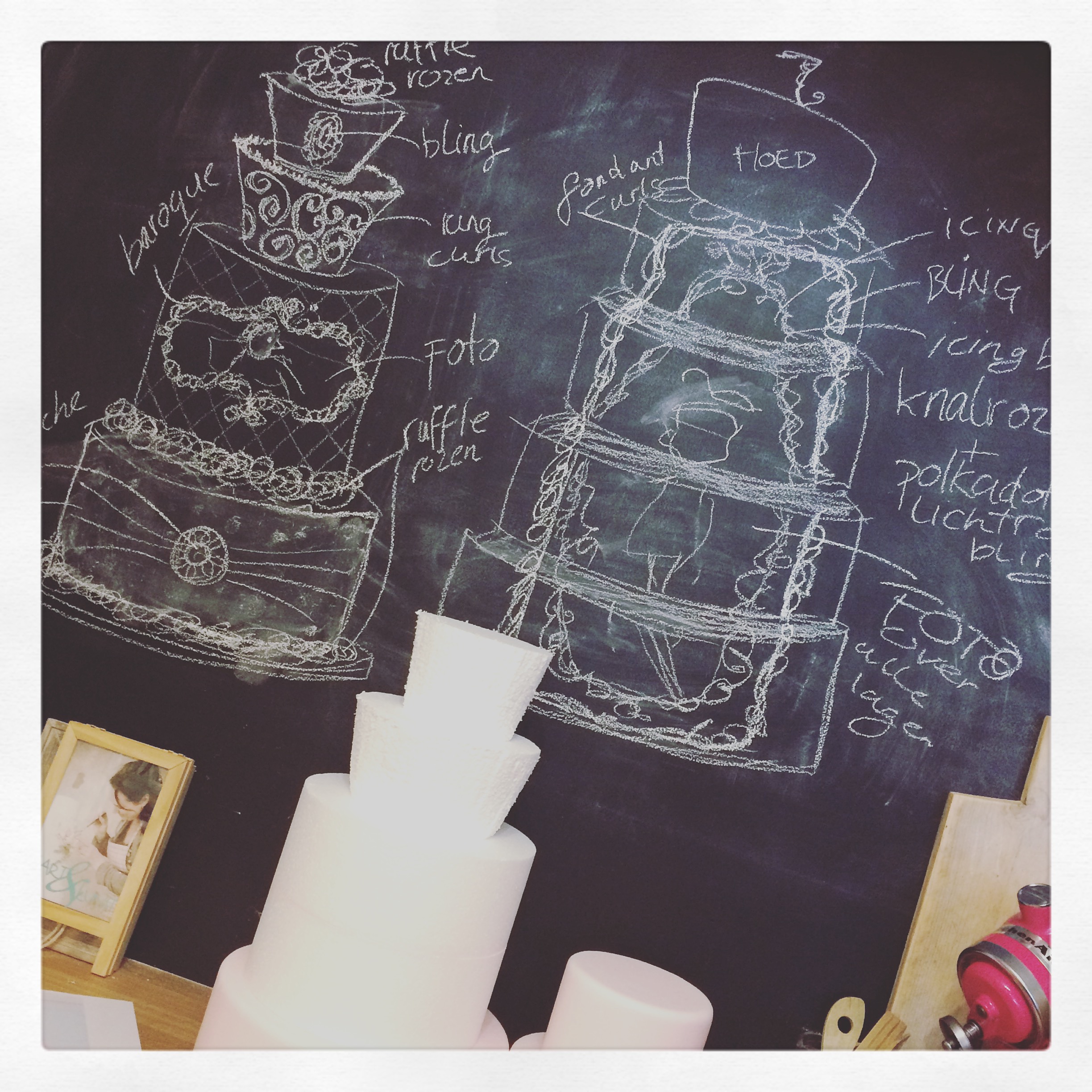 Een afspraak was snel gemaakt en zo zaten we een keer op een avond te schetsen en te brainstormen. Sanne wist natuurlijk wel ongeveer wat ik zo ongeveer deed, maar ze dacht dat foto’s op taarten alleen van die rechthoekige gevallen waren….. ze was blij verrast dat ook op “mooie” taarten een foto kon.