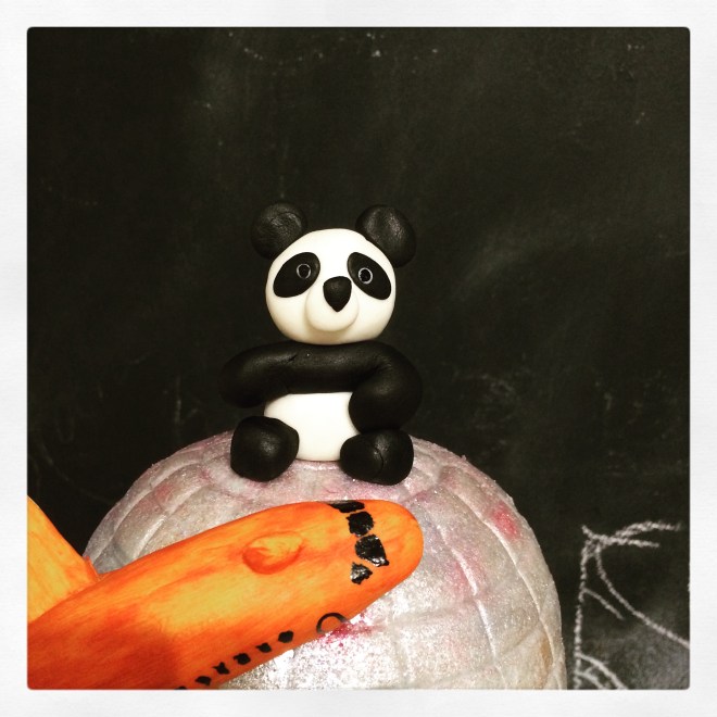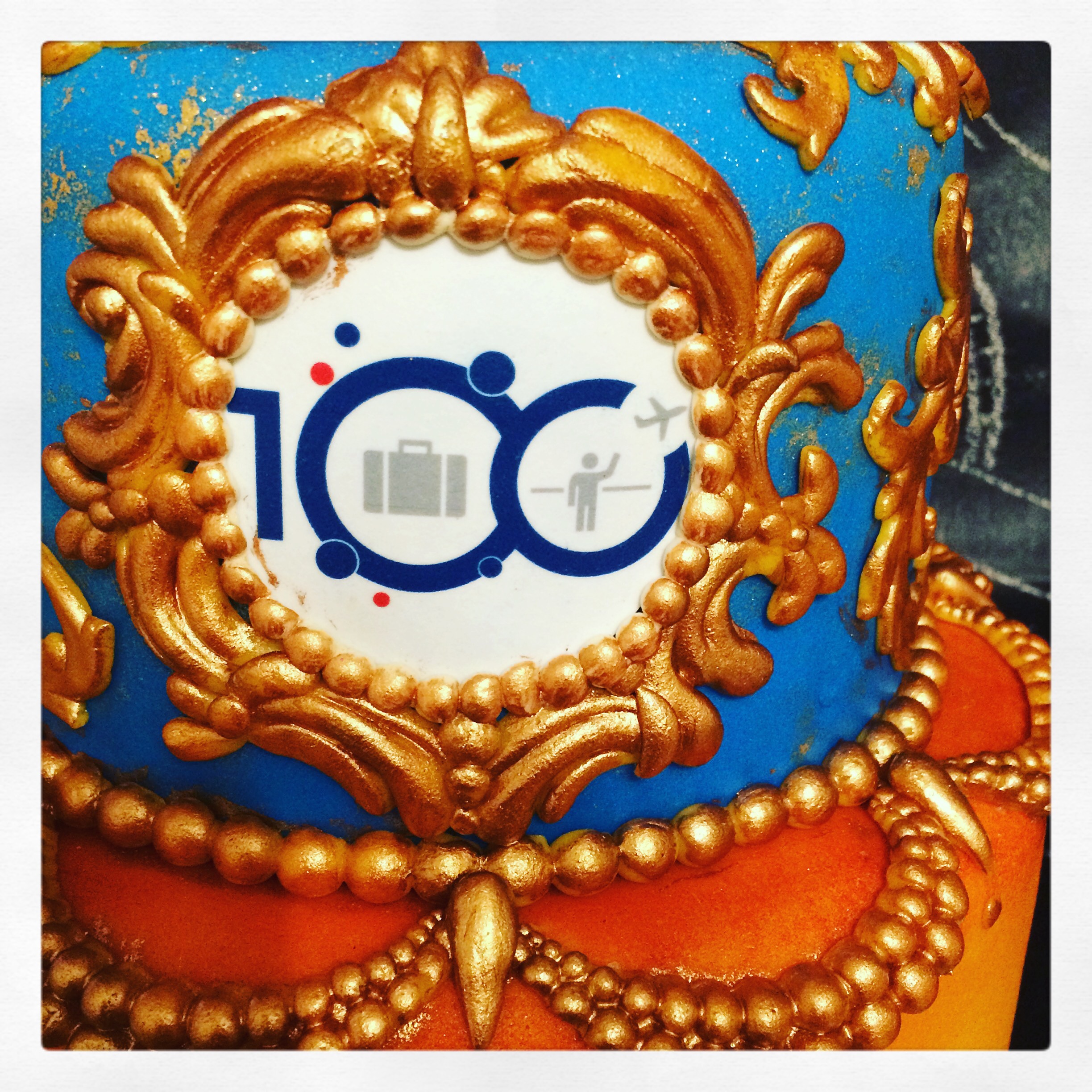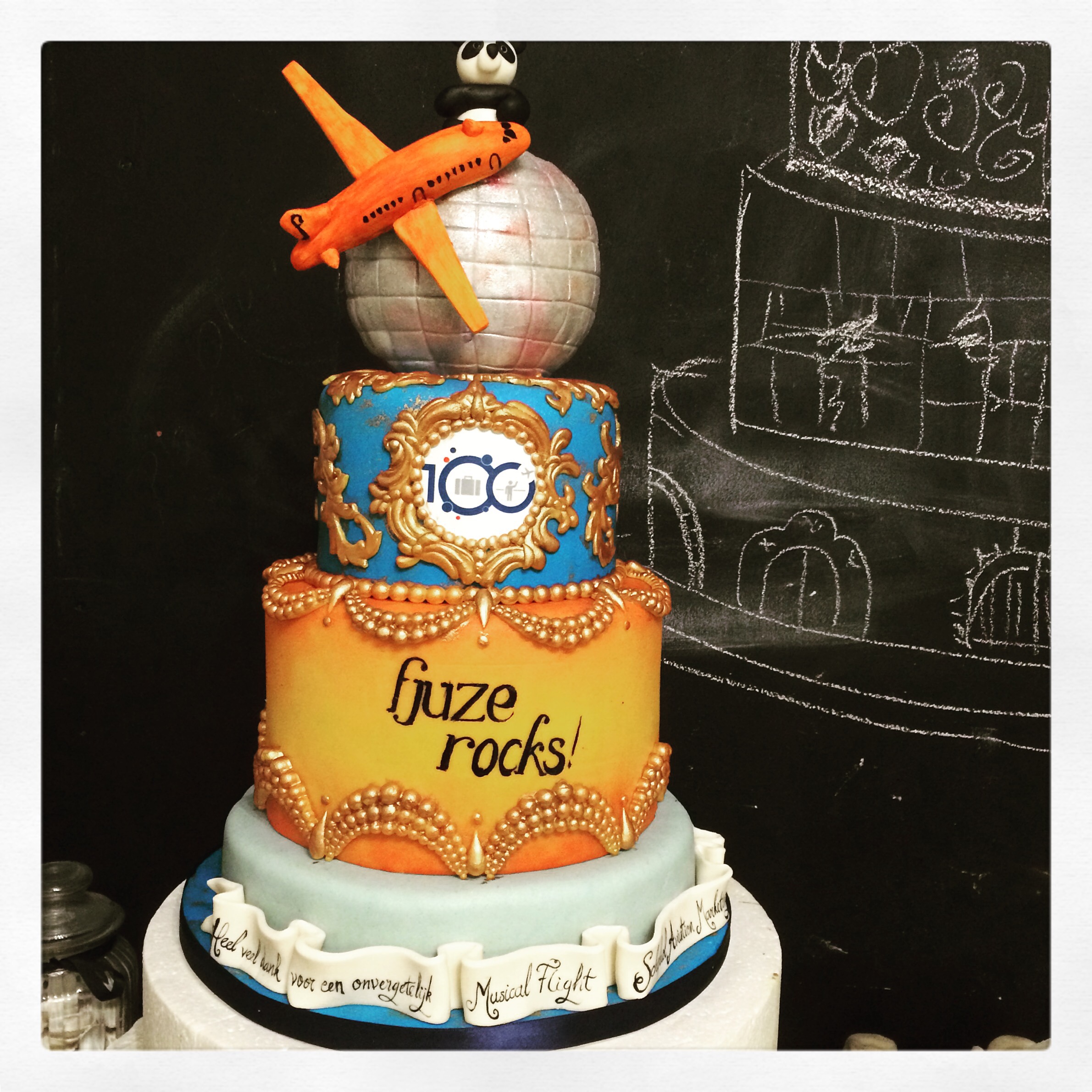 Schiphol heeft het weer voor elkaar…. een enthousiast bedrijf verwend met een op maat gemaakte taart. “Iets met pandaberen, een discobol, een oranje vliegtuigje en veel goud en glimmer…”