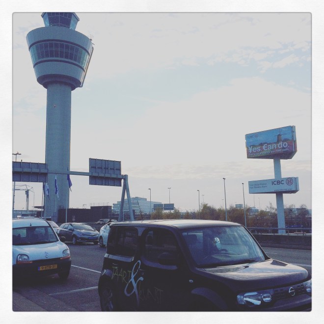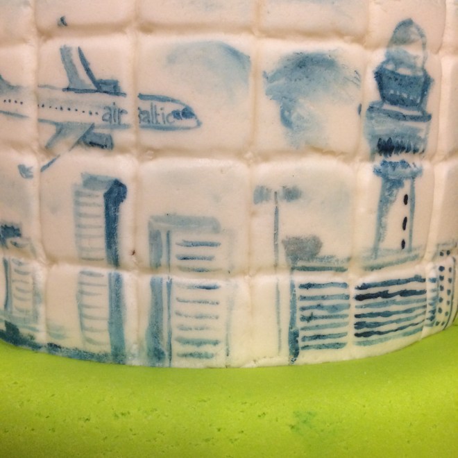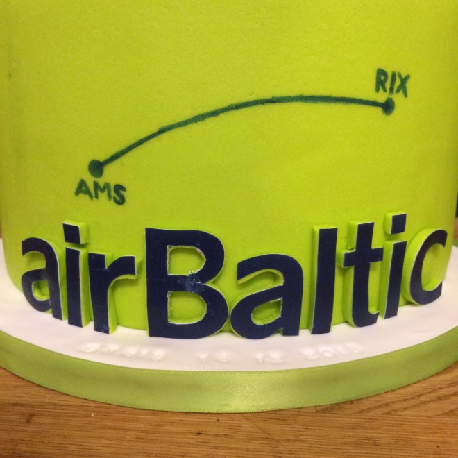 En bij een feestje hoort taart! Hij mocht niet te hoog worden, de taart moest immers nog door de scanner en door de douane 😉 Het is dus een beetje een plomp model maar toch nog wel fors aan de maat, de taart was voor 50 personen. Ook weer de Delfts-blauwe tegeltjes met afbeelding van Schiphol en verder vooral de heerlijke knalkleur van airBaltic!