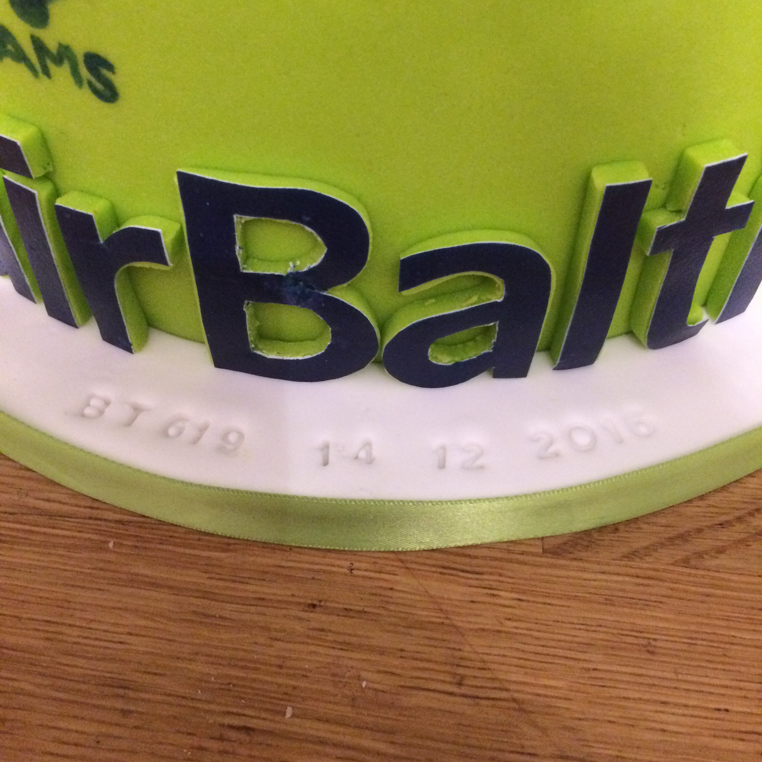 En bij een feestje hoort taart! Hij mocht niet te hoog worden, de taart moest immers nog door de scanner en door de douane 😉 Het is dus een beetje een plomp model maar toch nog wel fors aan de maat, de taart was voor 50 personen. Ook weer de Delfts-blauwe tegeltjes met afbeelding van Schiphol en verder vooral de heerlijke knalkleur van airBaltic!