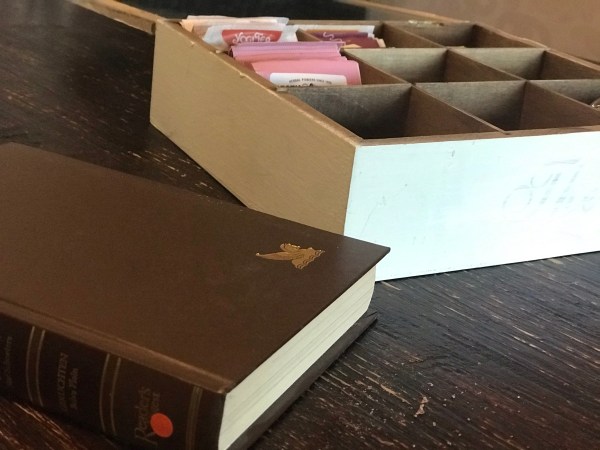 De tussenstukjes in de theedoos heb ik niet allemaal gebruikt, zodat er in totaal vier vakken ontstonden, twee langwerpige, één klein en één groot vierkant. In het grote vierkant wilde ik het kraamboekje. Hiervoor heb ik het boek op maat gesneden. Mr TAARTenkUNST boos, want die had het boek eigenlijk willen lezen…. haha, lag al een jaar in de kast hoor en de kringloopwinkel staat er vol mee, dus dat zal wel loslopen.