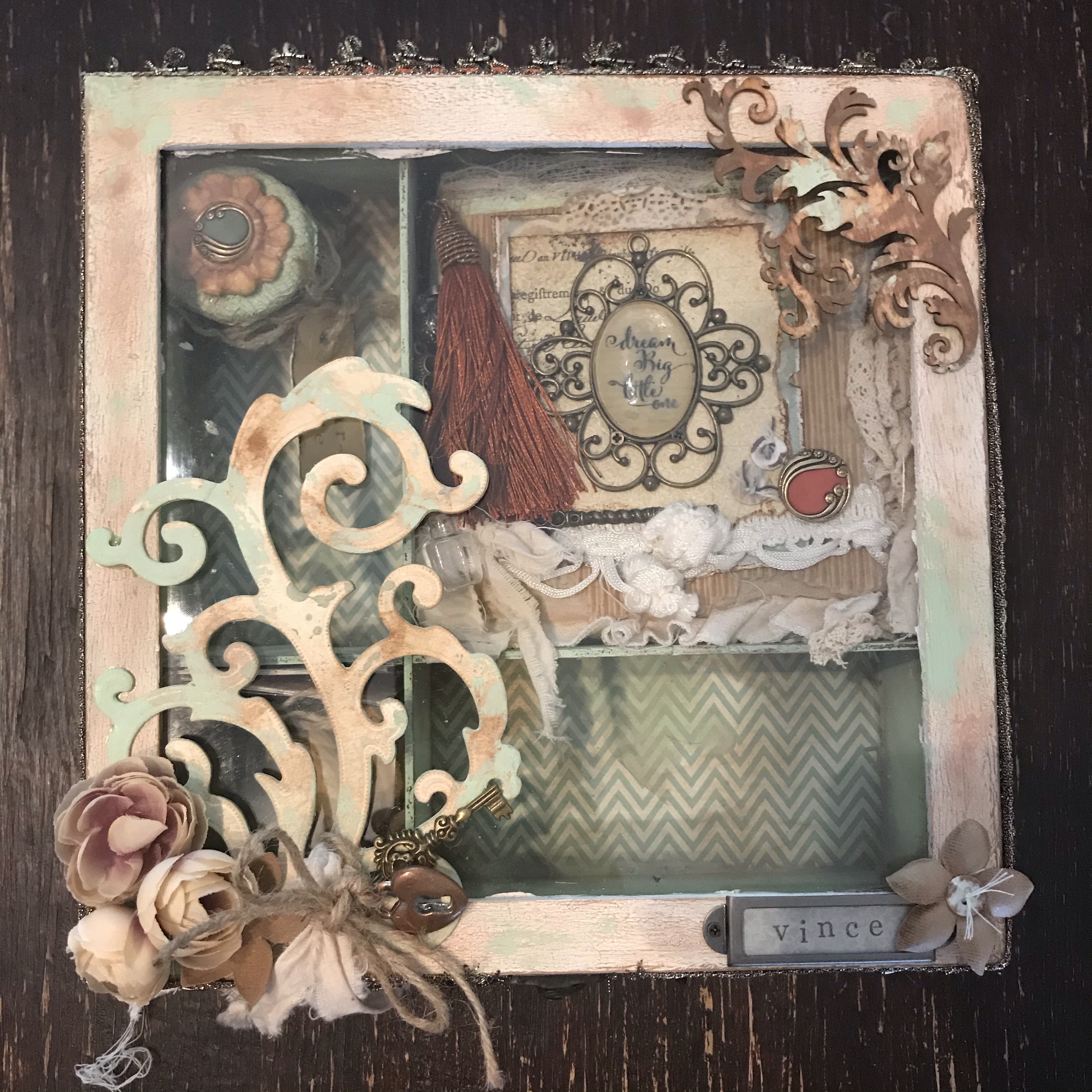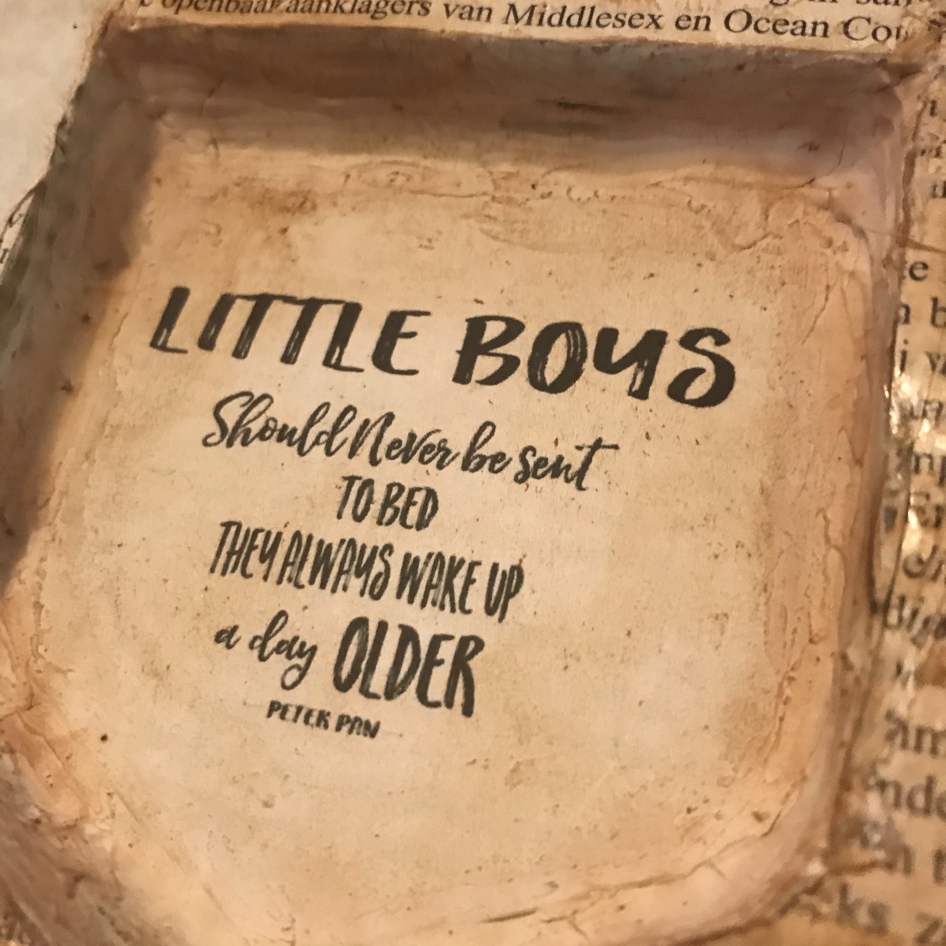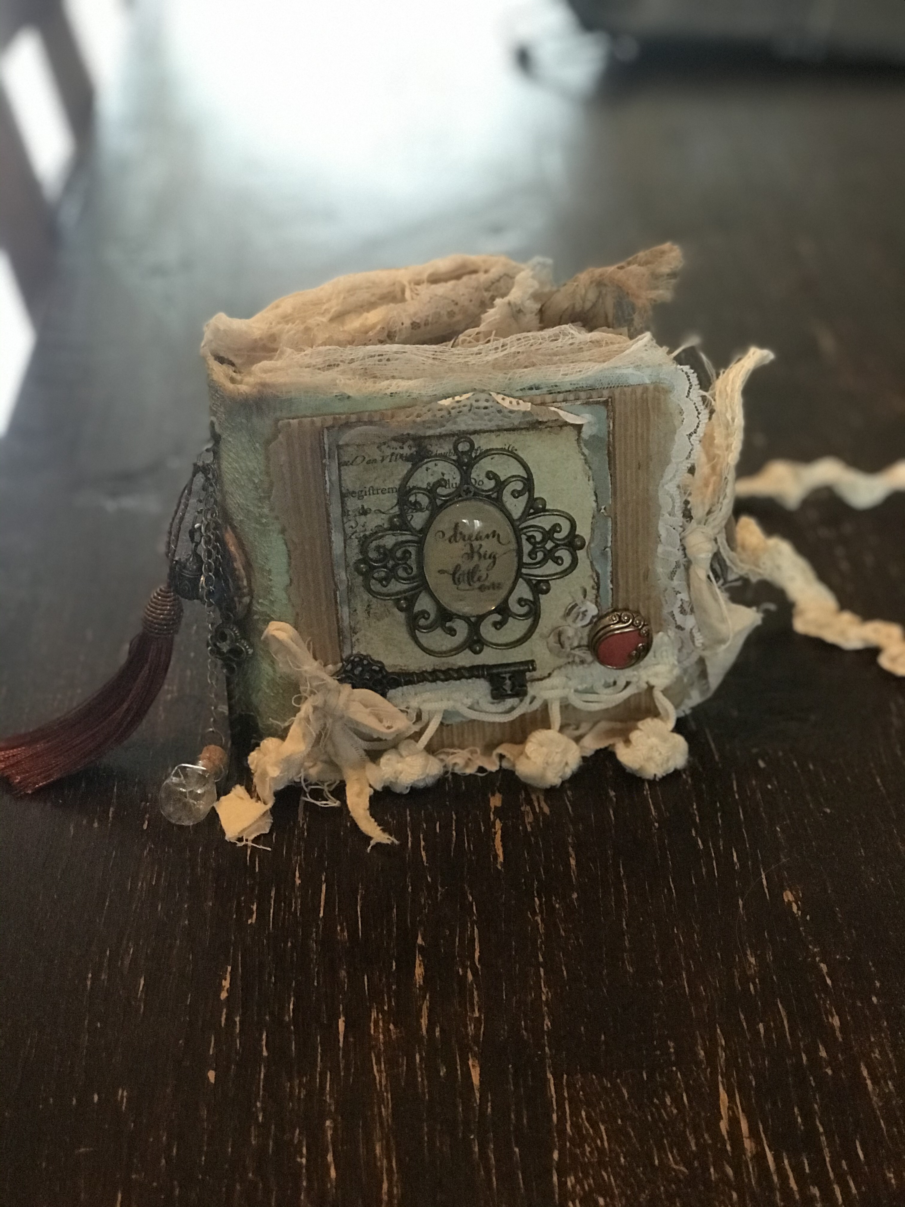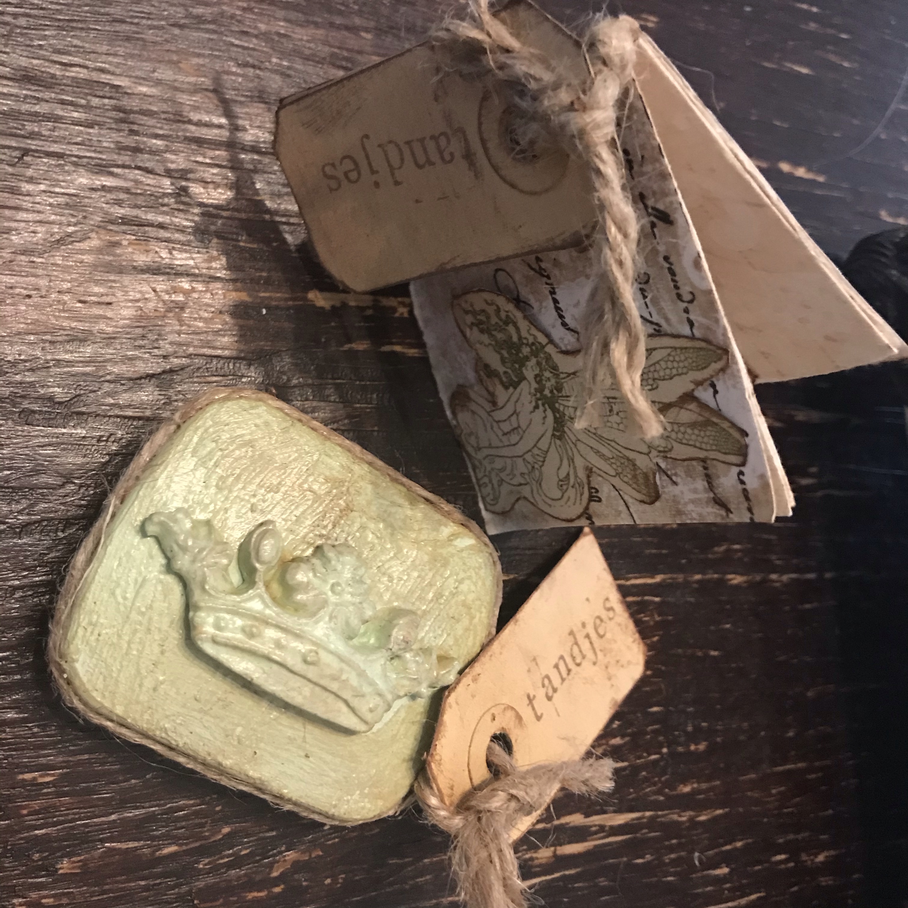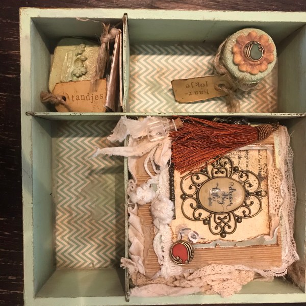 Ik ben bonustante geworden! De zoon van de vrouw van mijn vader en zijn vriendin zijn ouders geworden van een prachtig ventje…. Lang geleden dat ik écht aan de knutsel was (behalve voor mezelf dan) maar ik heb me heerlijk uitgeleefd op een kringloopboek en een oude theedoos…..