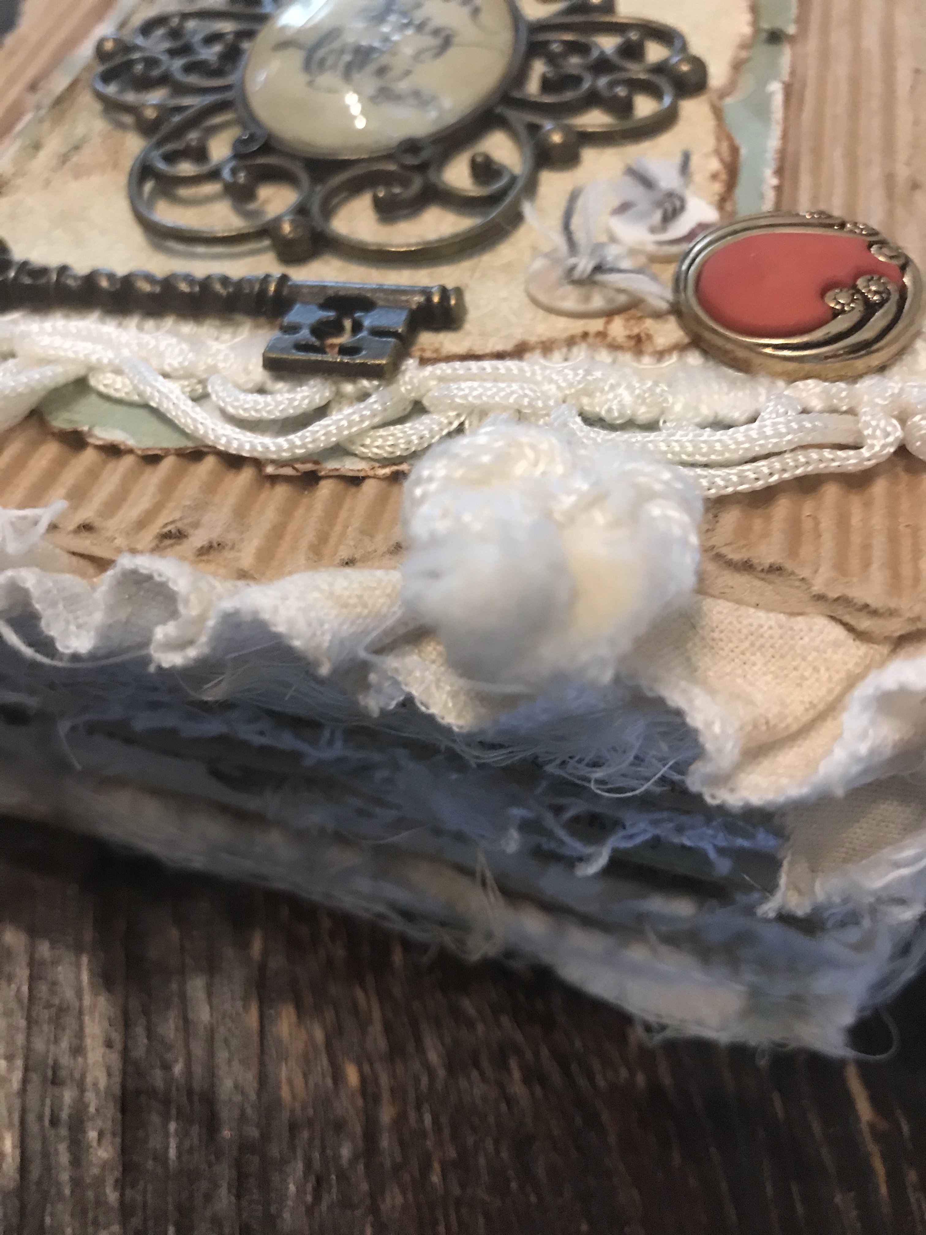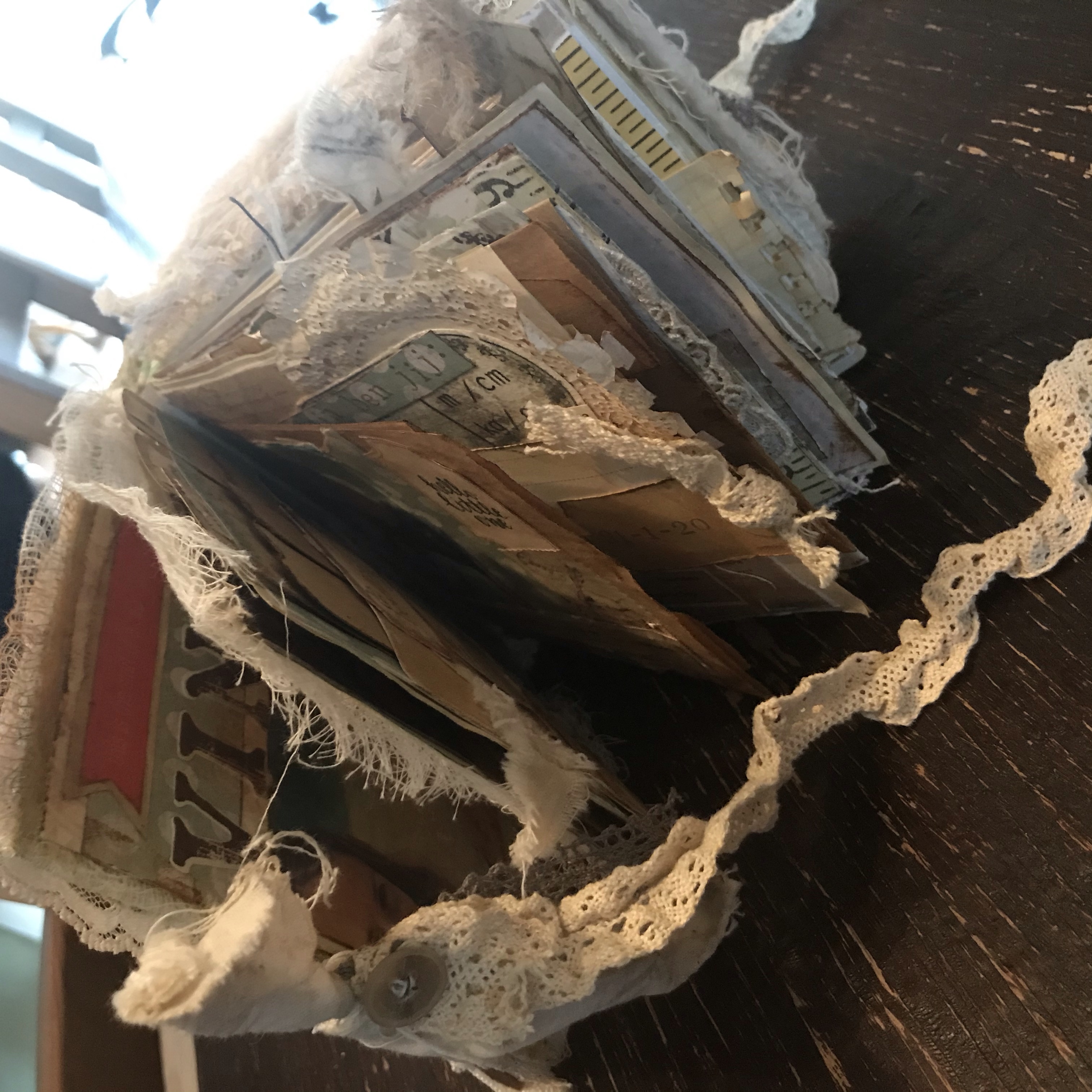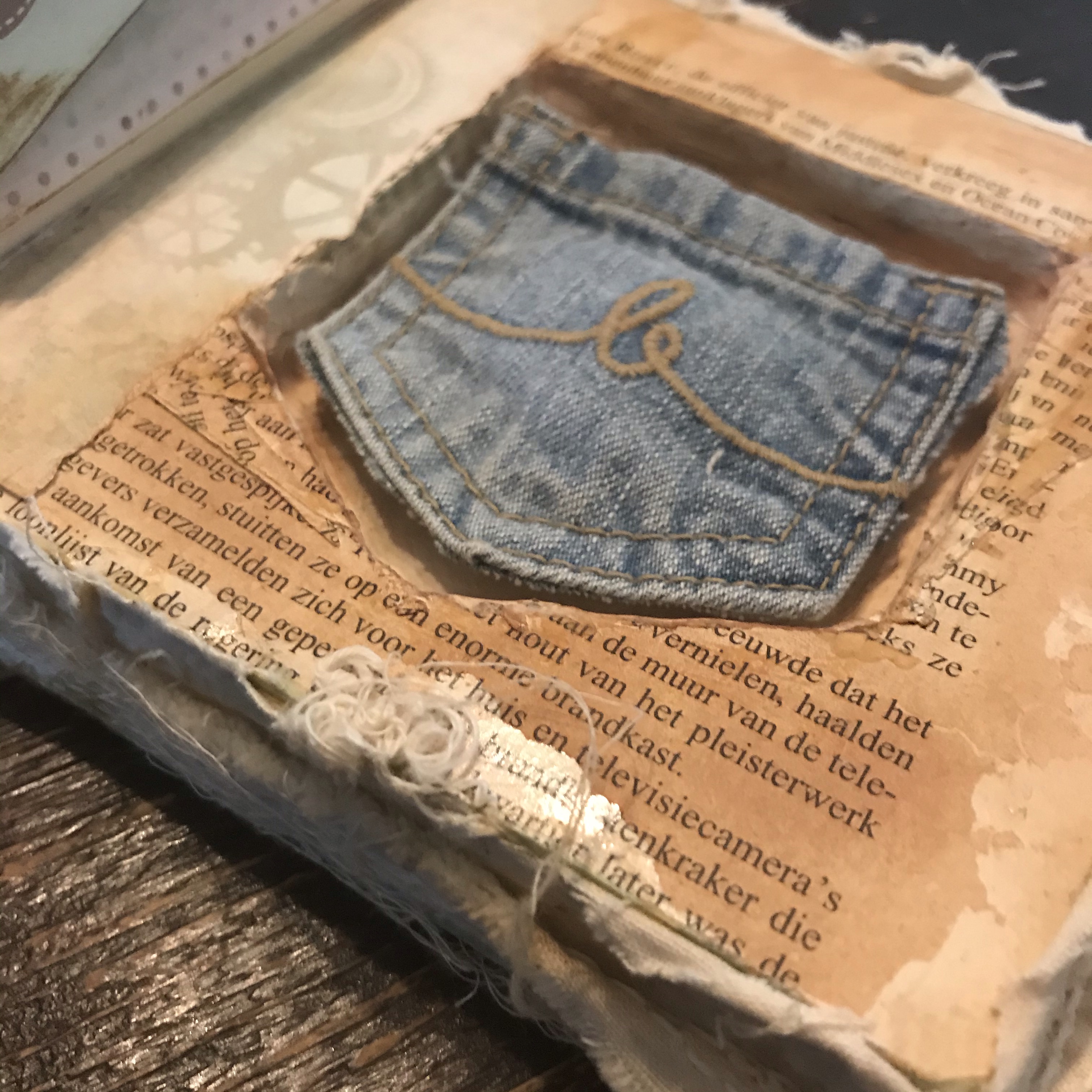 Ik wilde een “geheim” opbergvak ín het boek maken en dus eerst een heleboel bladzijdes aan elkaar gelijmd. Je hoeft niet elke bladzijde helemaal in te smeren met lijm, de randen is genoeg, daarna een nacht in een klem en dan is het al best stevig. Ik vond een oud stukje jeansstof, een zakje, ik denk van een jurkje van één van de meisjes. Ik bewaar dat soort dingen nou eenmaal en soms… heel soms is het dan precies wat je zoekt!