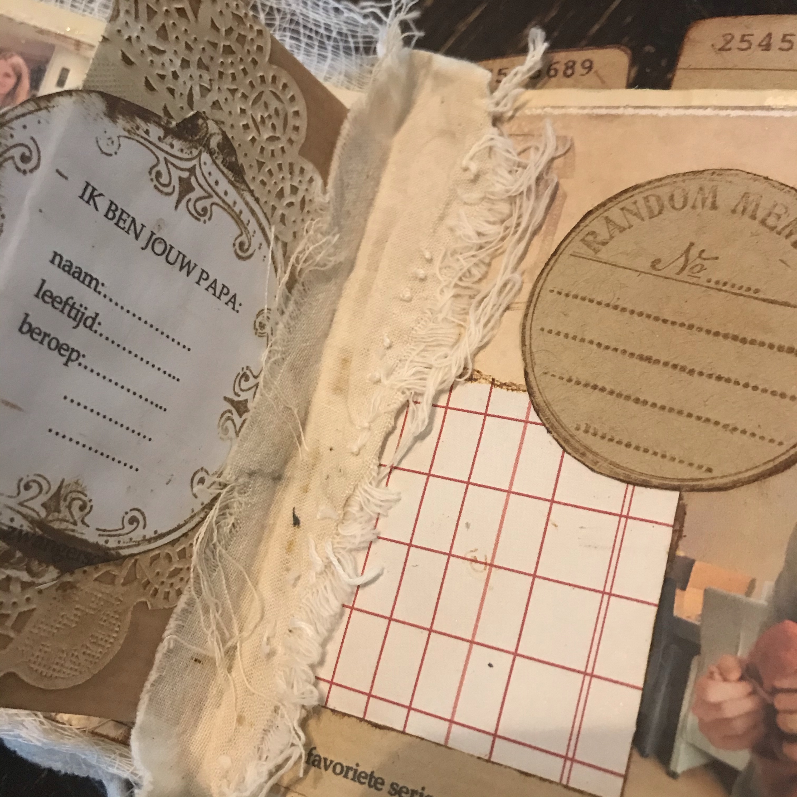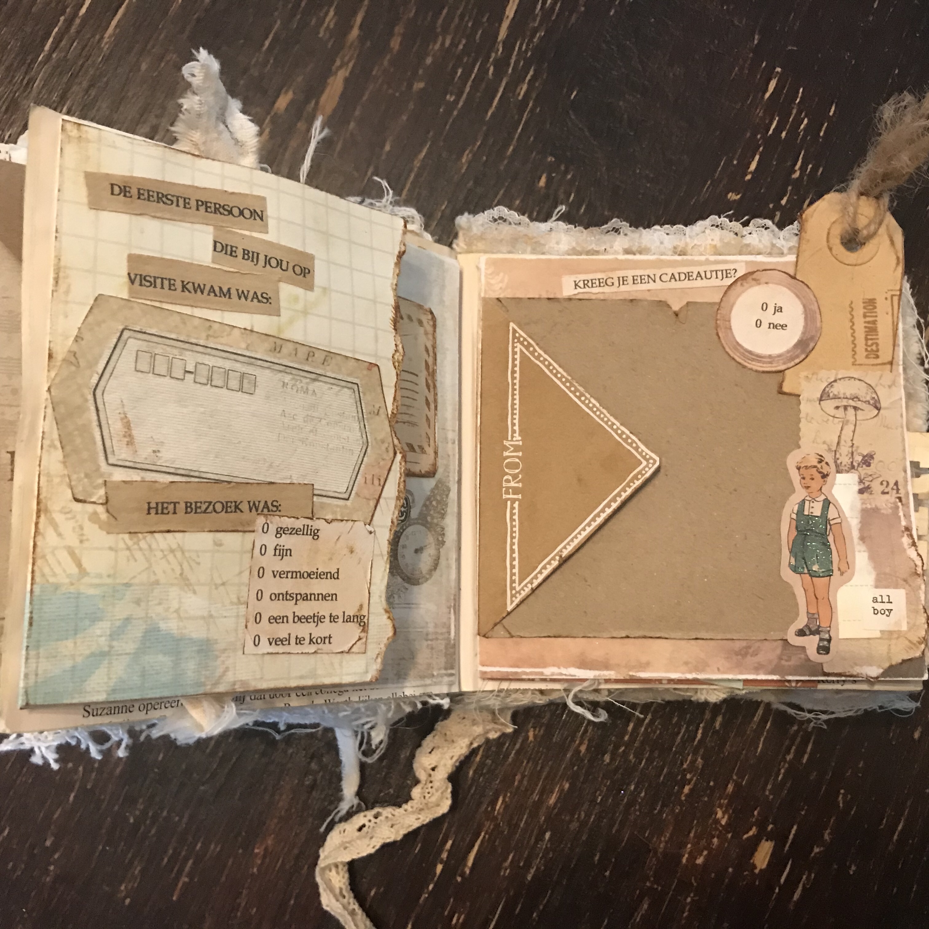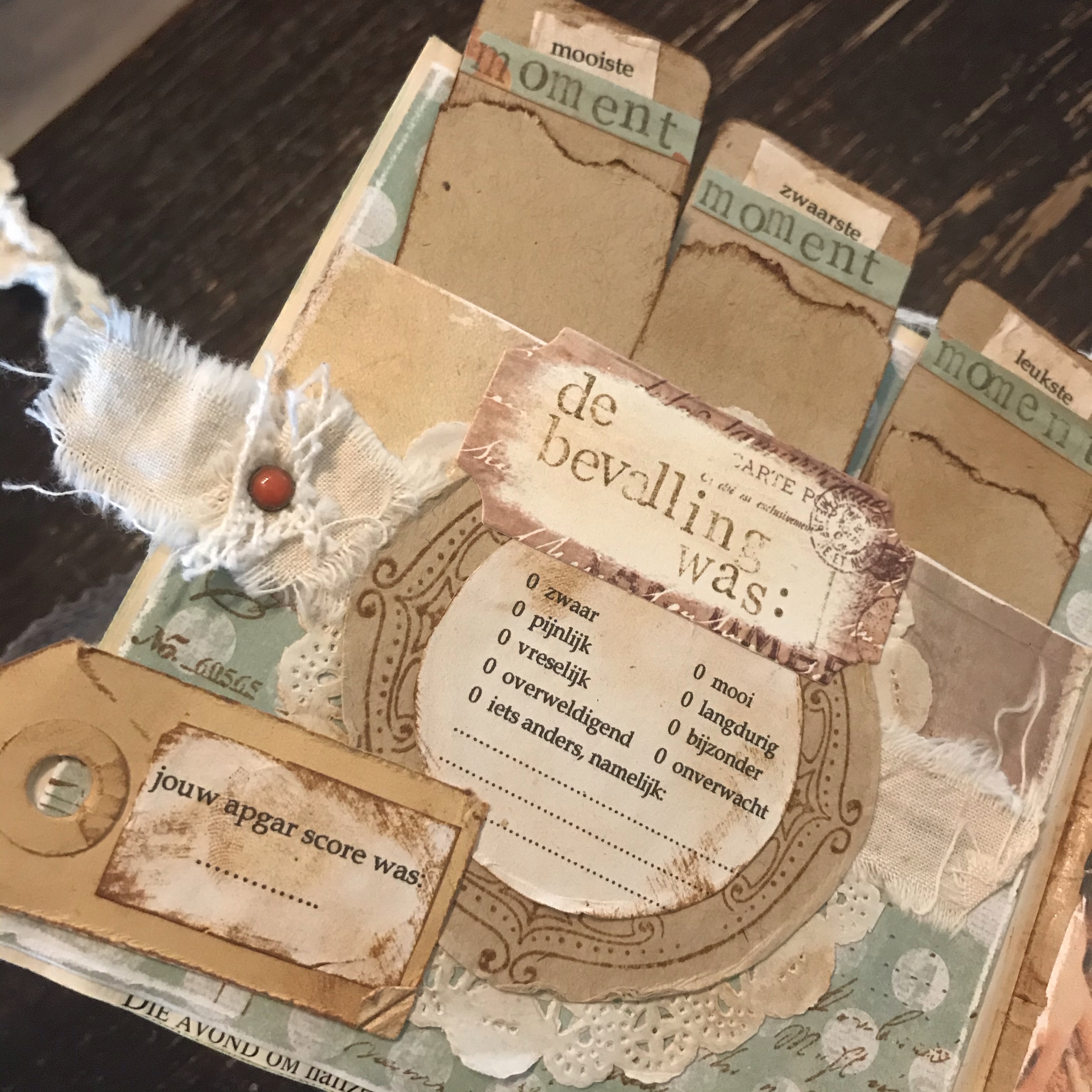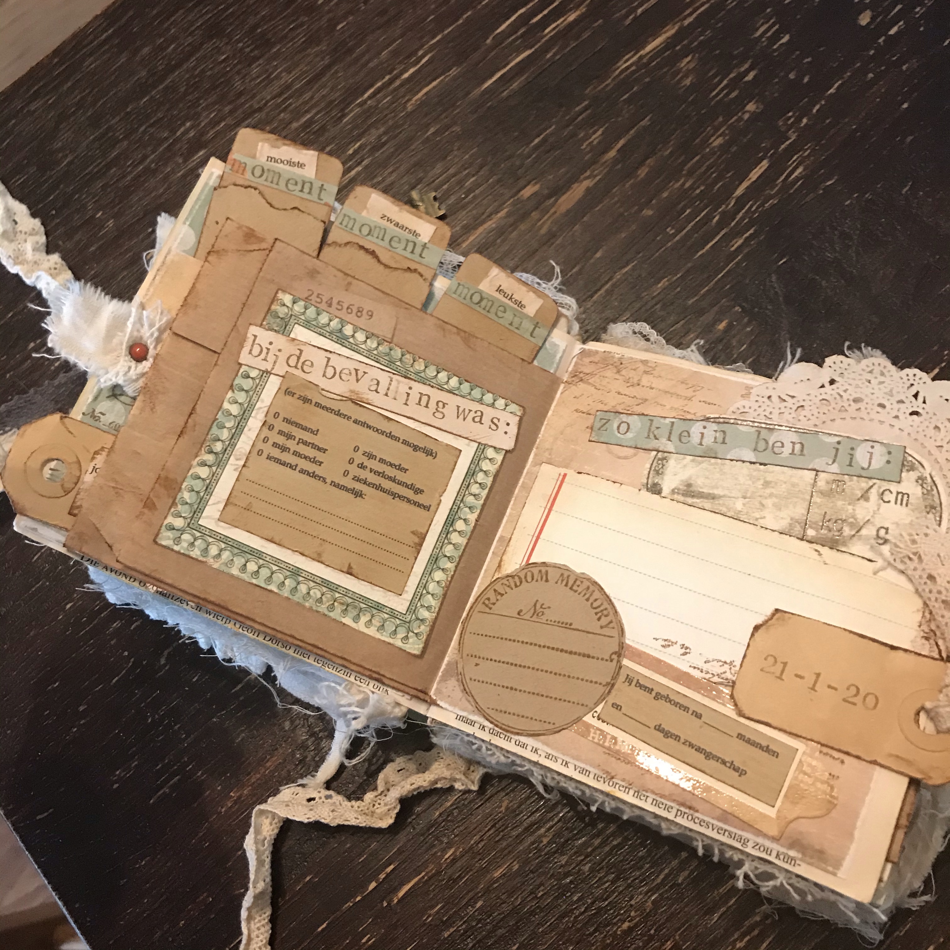 Ik heb de tekstjes voor het kraamboekje zelf geprint, de pagina’s heb ik vooraf gemaakt en daarna in het boekje ingeplakt. Ik heb daarvoor wel een paar bladzijdes helemaal aan elkaar vastgelijmd, want het waren zulke dunne blaadjes dat ik bang was dat het anders meteen zou scheuren. Lekker veel stof en kant gebruikt en een paar foto’s die ik doorgestuurd had gekregen van “papa”.