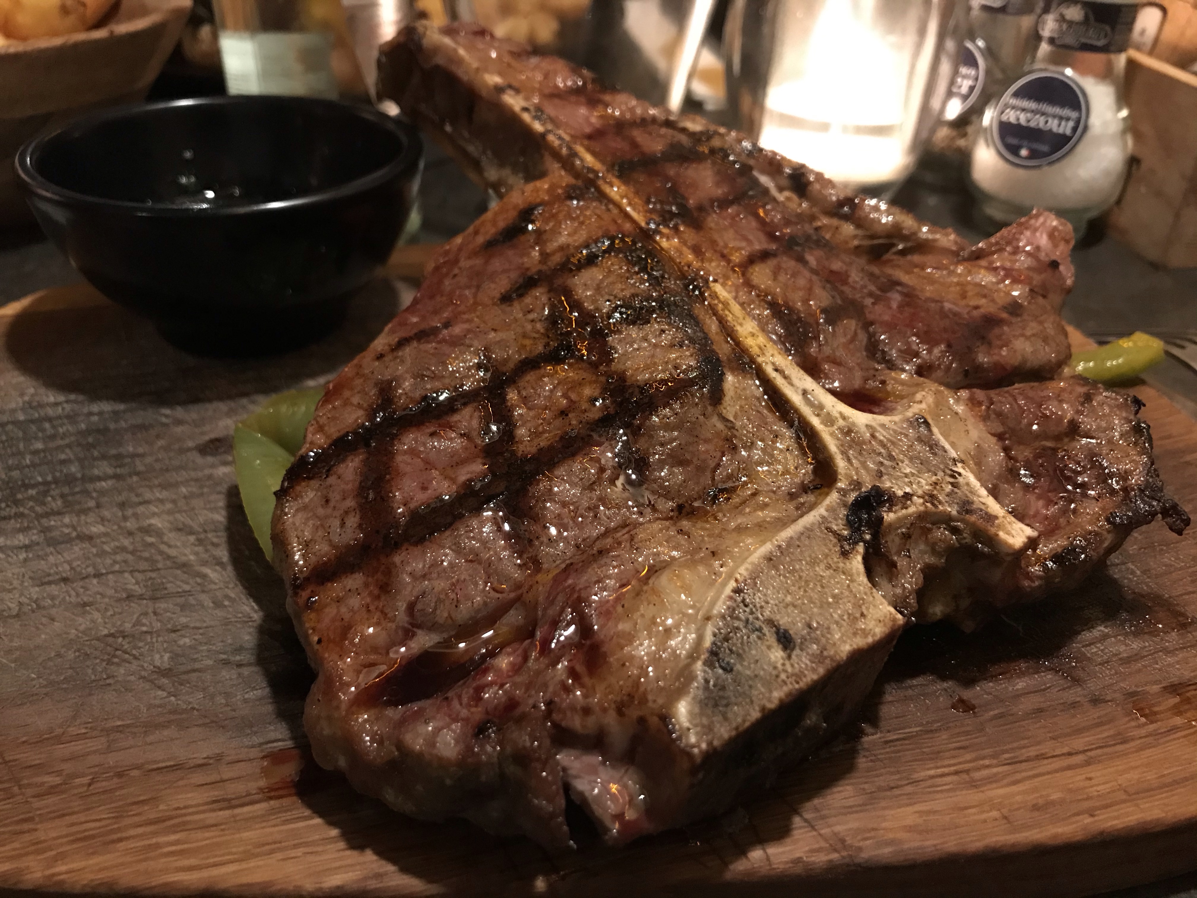 Zoals de naam van dit restaurant al doet vermoeden, kun je bij Meat & Co heel veel vlees op de kaart vinden. We hadden via Social Deal een driegangen keuzemenu en de keuze was letterlijk reuze. Voor sommige gerechten gold een meerprijs, zo ook voor de T-bone steak. Maar het was al zo lang geleden dat ik zo’n knoeperd heb gegeten en omdat ik gewoon trek had in een goed stuk vlees, besloot ik om het erop te wagen…. Geen seconde spijt van! Goed gegrild, lekkere groenten erbij en een fijne groene kruiden dip… Op het menu ook veel burgers, mr TAARTenkUNST koos de grootste uit 😉