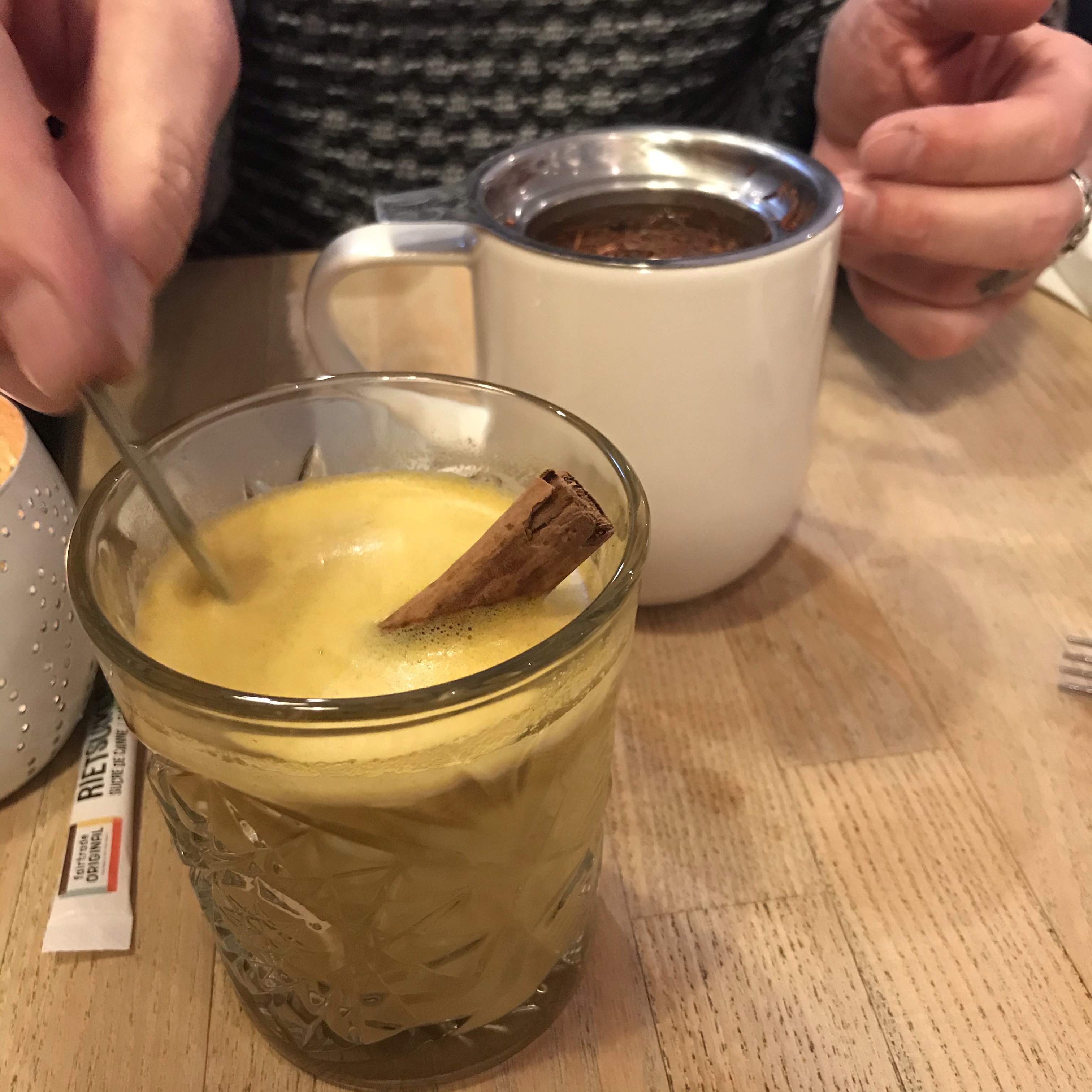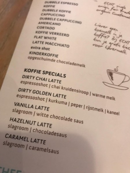 Wat een verrassing om het dan ook gewoon op de kaart bij Echt tegen te komen! En niet alleen een “gewone” golden latte (dat is dus thee), maar ook een heuse Dirty Golden Latte. Het zal je niet verbazen dat ik die meteen móest proberen. Omdat het vreselijk slecht weer was en we het koud hadden was het een schot in de roos. Echt perfect!