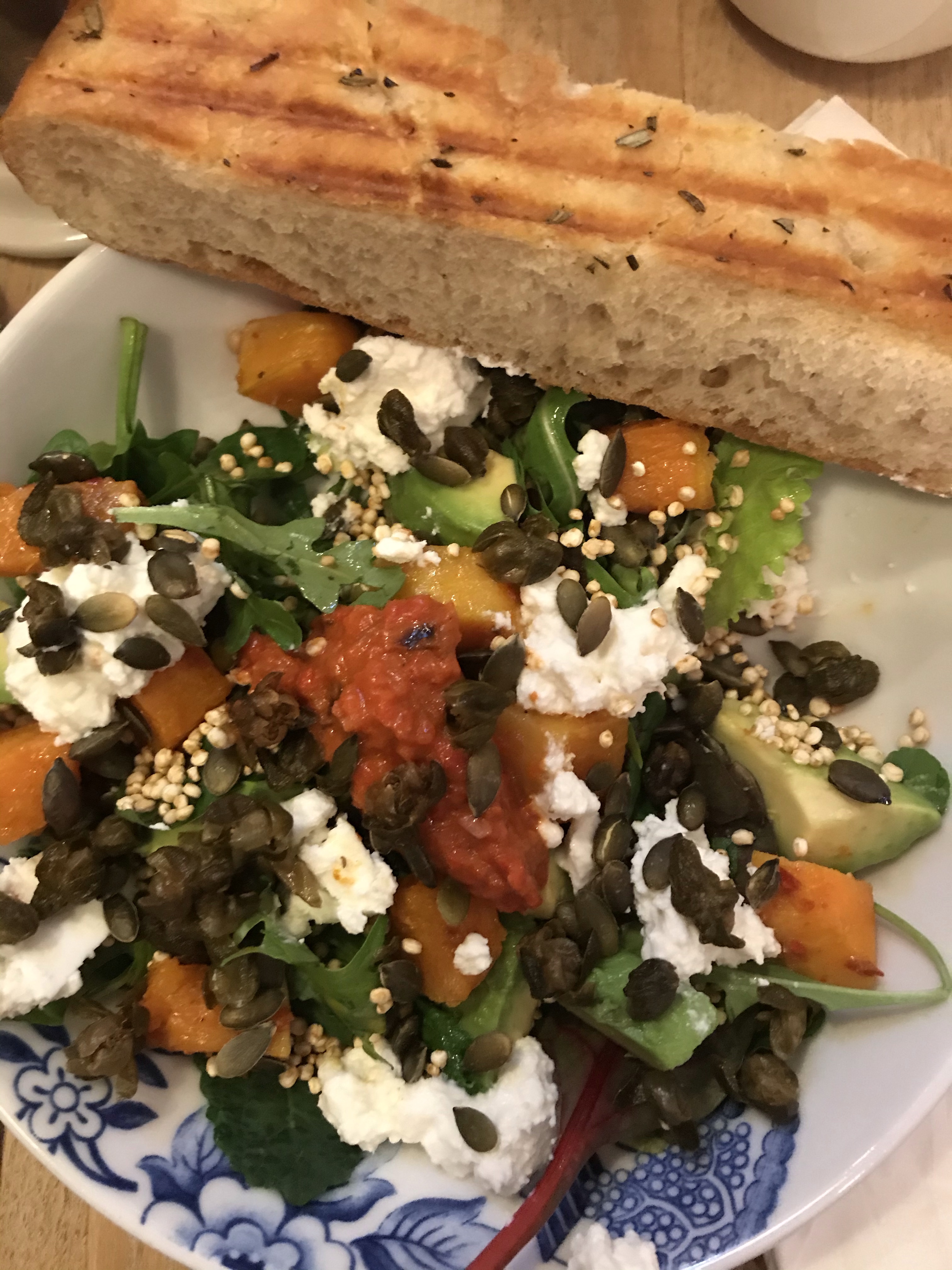 Onze lunch was niet minder geweldig. Mr TAARTenkUNST koos de ta’amaya (egyptische falafel) met salade en crème fraîche. Ik had een salade met ricotta, harissa, pompoen en gefrituurde (!!!) kappertjes. Die kappertjes waren grappig, iets om te onthouden!