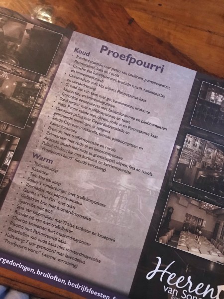 De vorige keer dat we in Alkmaar waren aten we ook al bij de Heeren van Sonoy. Ik had toen op de website gelezen over de Proefpourri. Een soort “all you can eat” concept maar dan wat sjieker. Ik had toen níet gelezen dat je hiervoor moest reserveren. We hebben toen genoten van de “chef’s special”, helemaal geen straf!