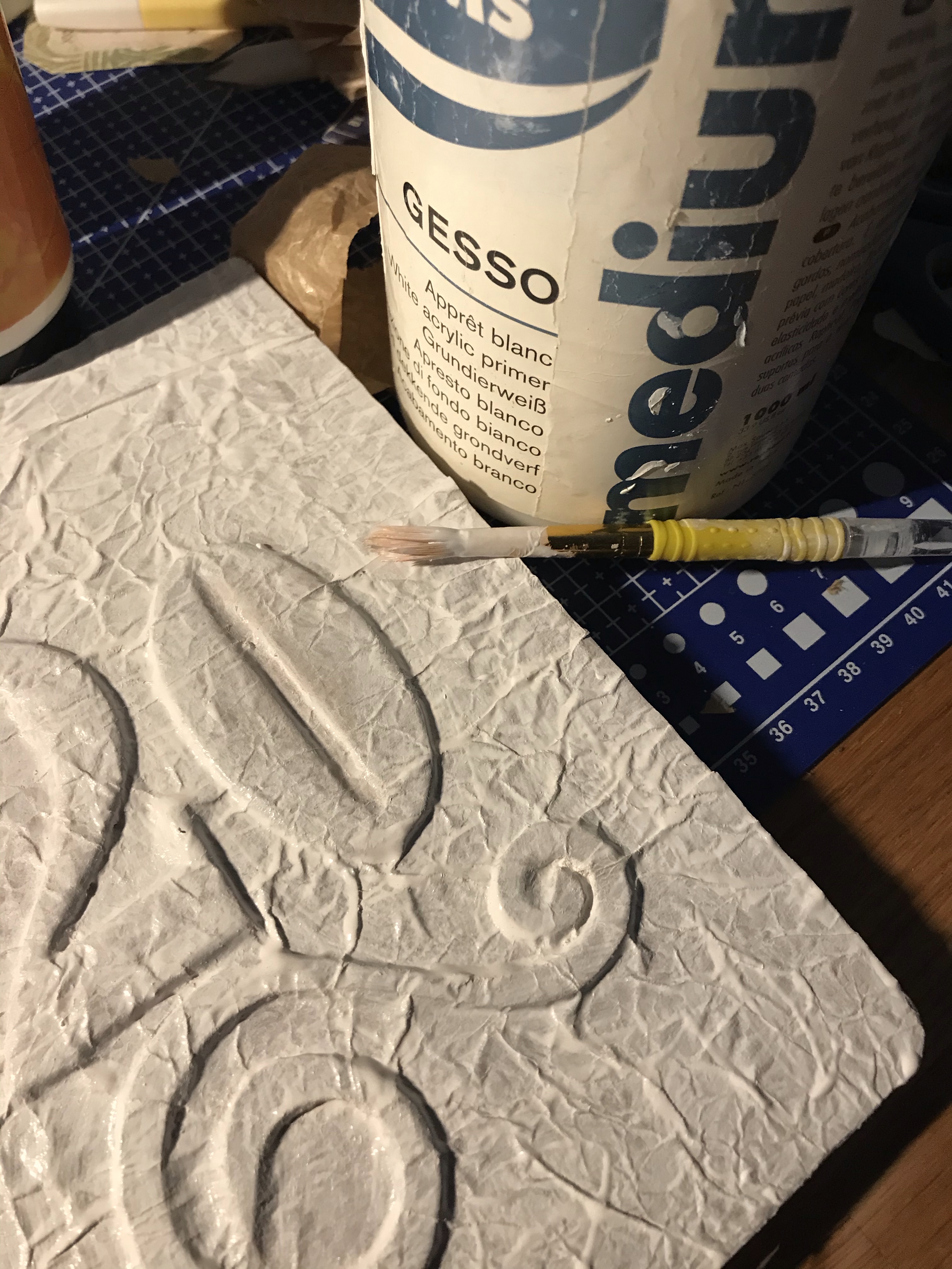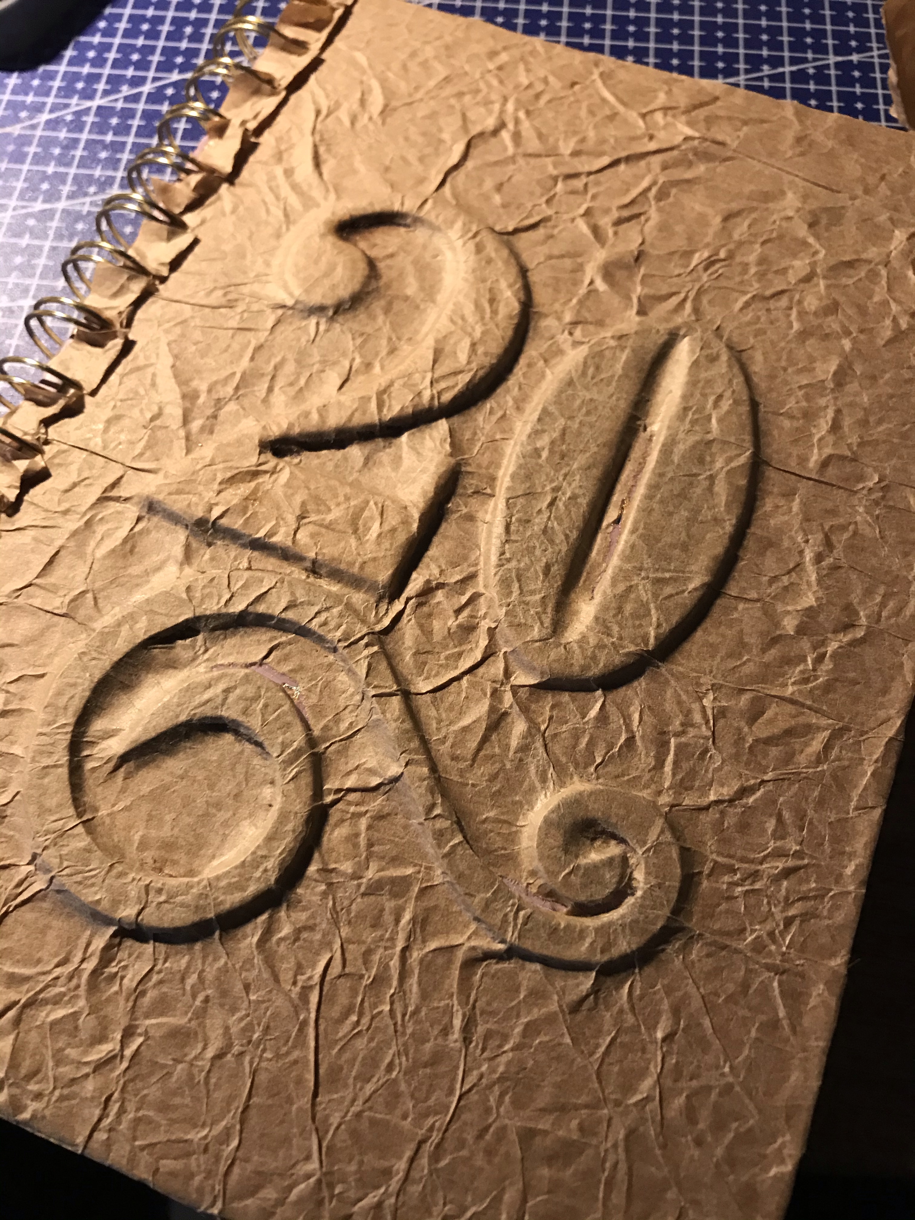 Mijn BuJo was een kerstcadeau, de Kerstman heeft hem bij de Hema gekocht. Ik denk niet dat deze nog in het assortiment is, maar vast wel andere leuke modellen. Nou vond ik de kaft sowieso veel te saai en daarom ben ik lekker aan het kliederen geweest. Een kraft zakje gekreukeld en als ondergrond over de letters “20” (het jaar) en nog een swirl geplakt. Toen in de gesso gezet en daarna…. ja daarna los en nog niet klaar. In elk geval komen de gouden papiertjes uit Thailand weer goed van pas…