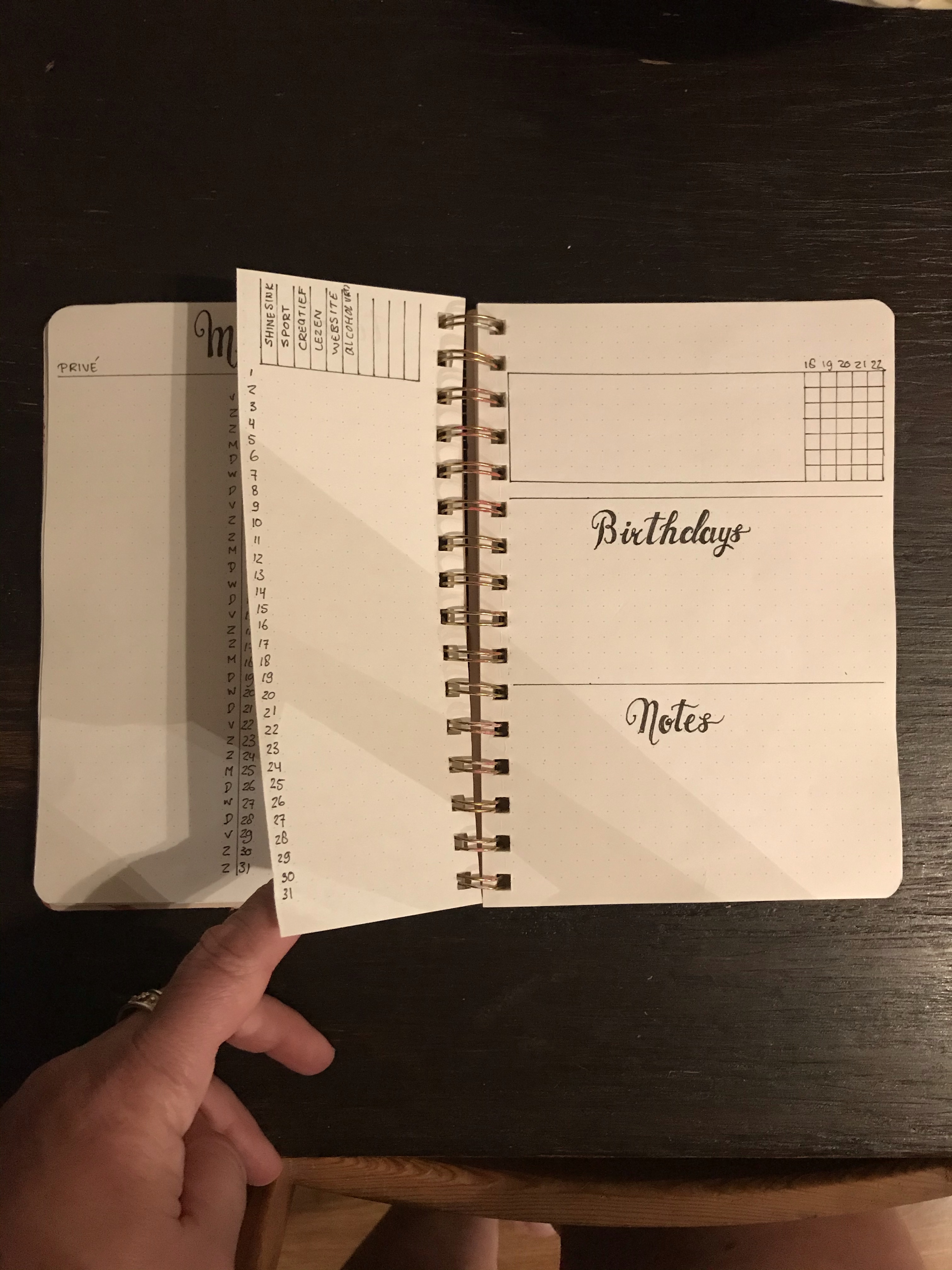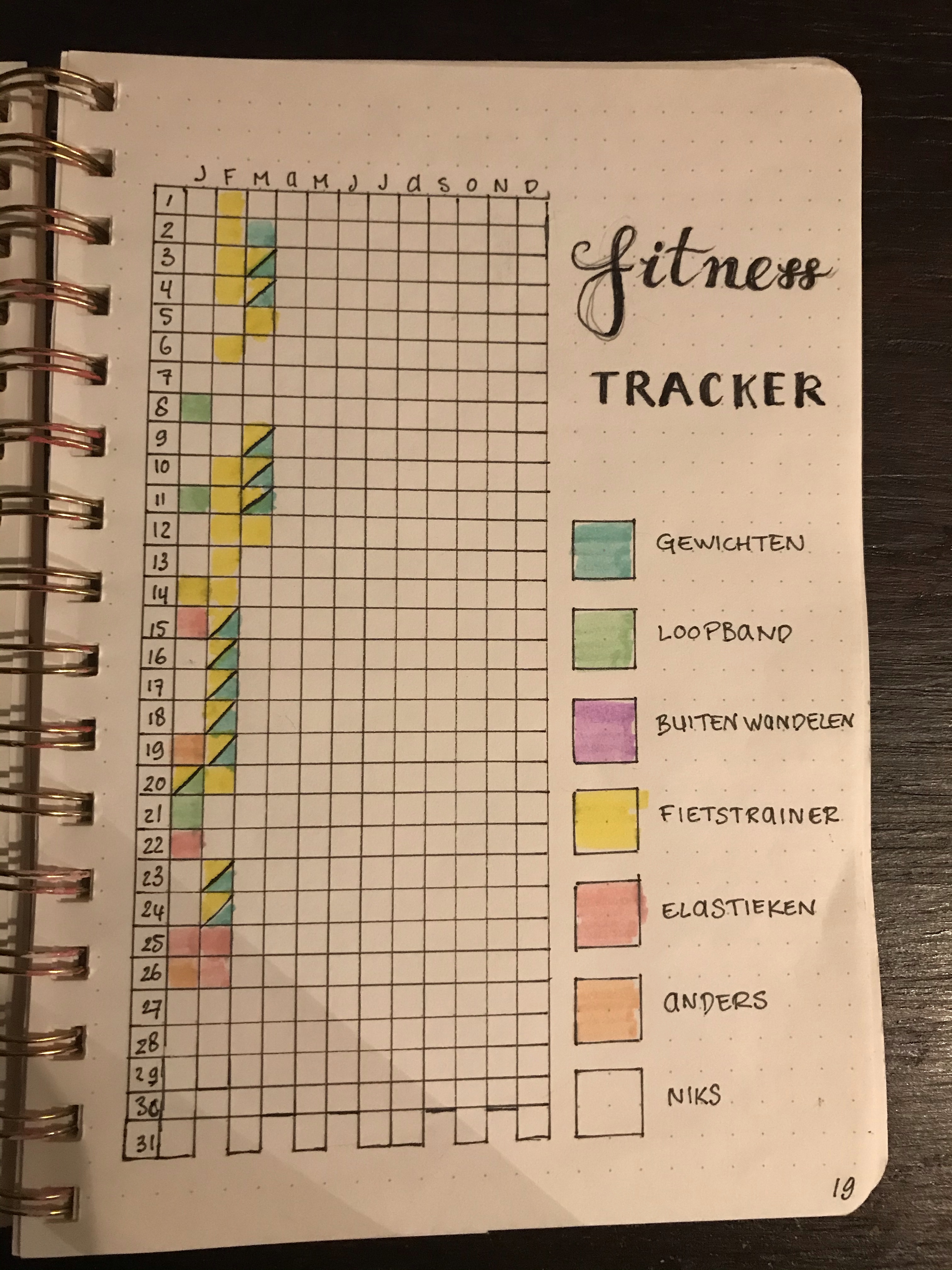 En omdat ik natuurlijk dit jaar ook weer eens flink met mijn gezondheid aan de slag wil (moet), heb ik er een “fitness tracker” en een “body tracker” aan toegevoegd…. Verder verjaardagen, notities, wekelijkse klussen en een maandoverzicht waarin werk en prive apart staan. Ook een “to do lijst” en een dagelijkse dingen lijstje….