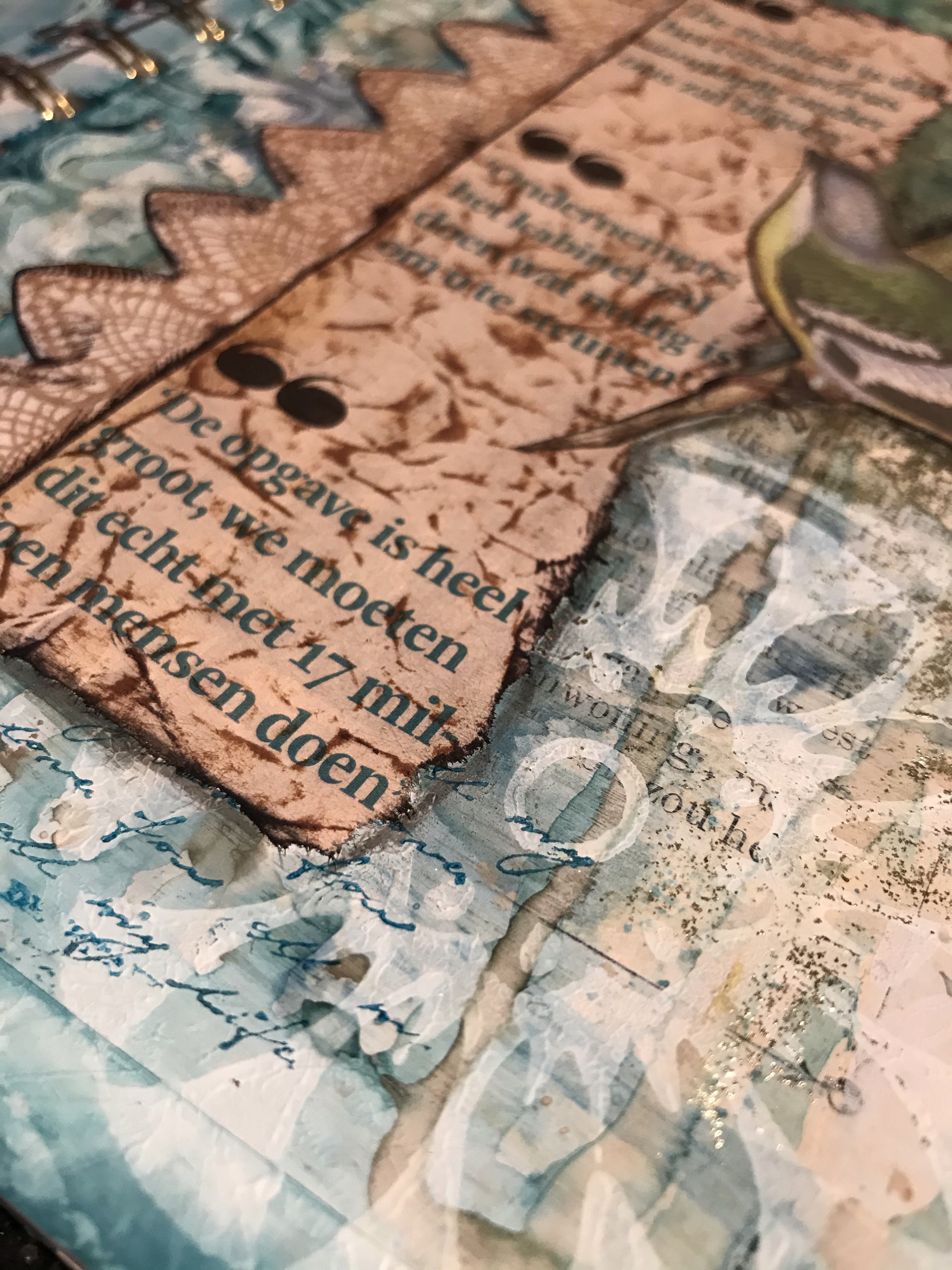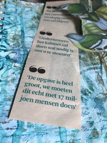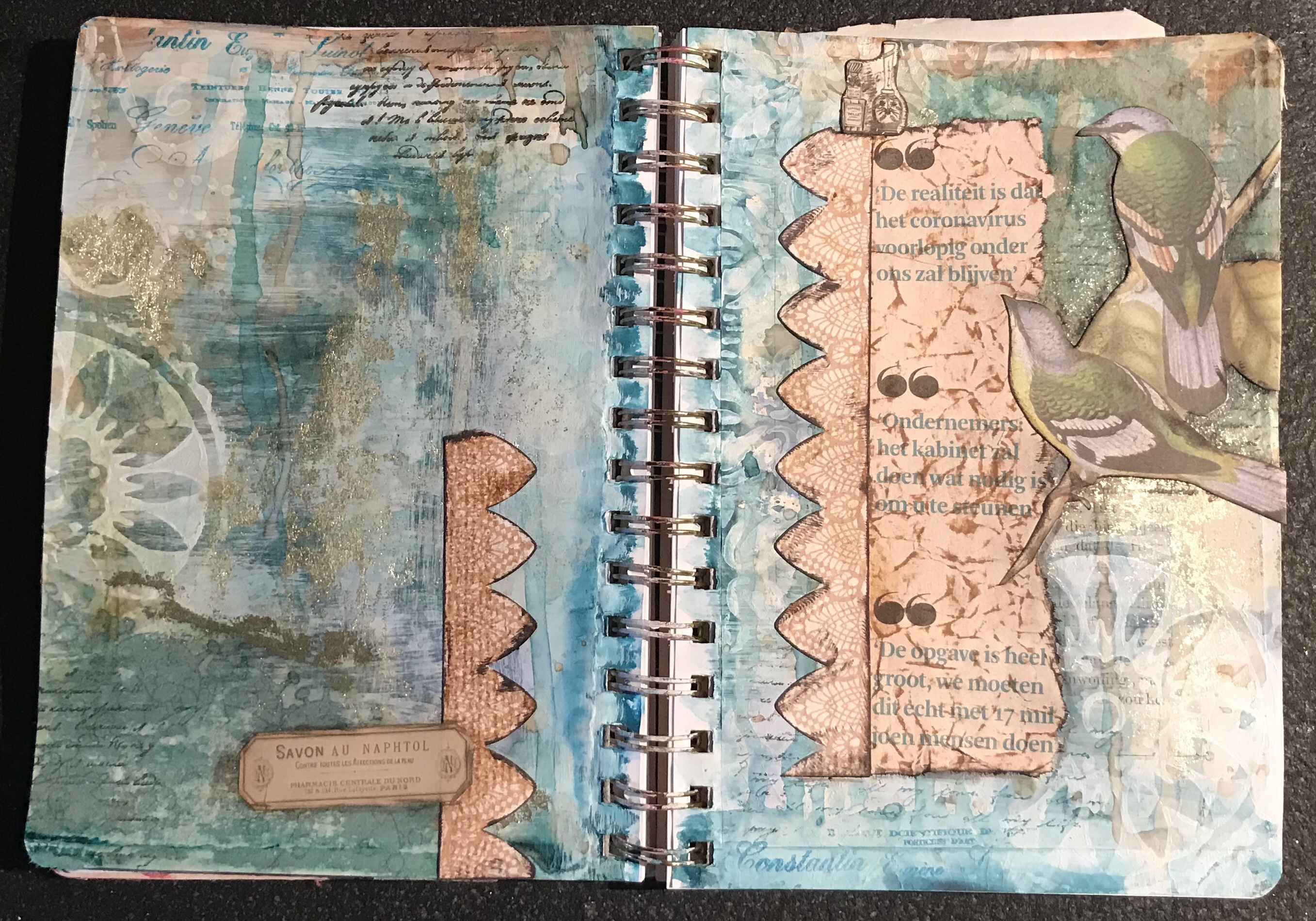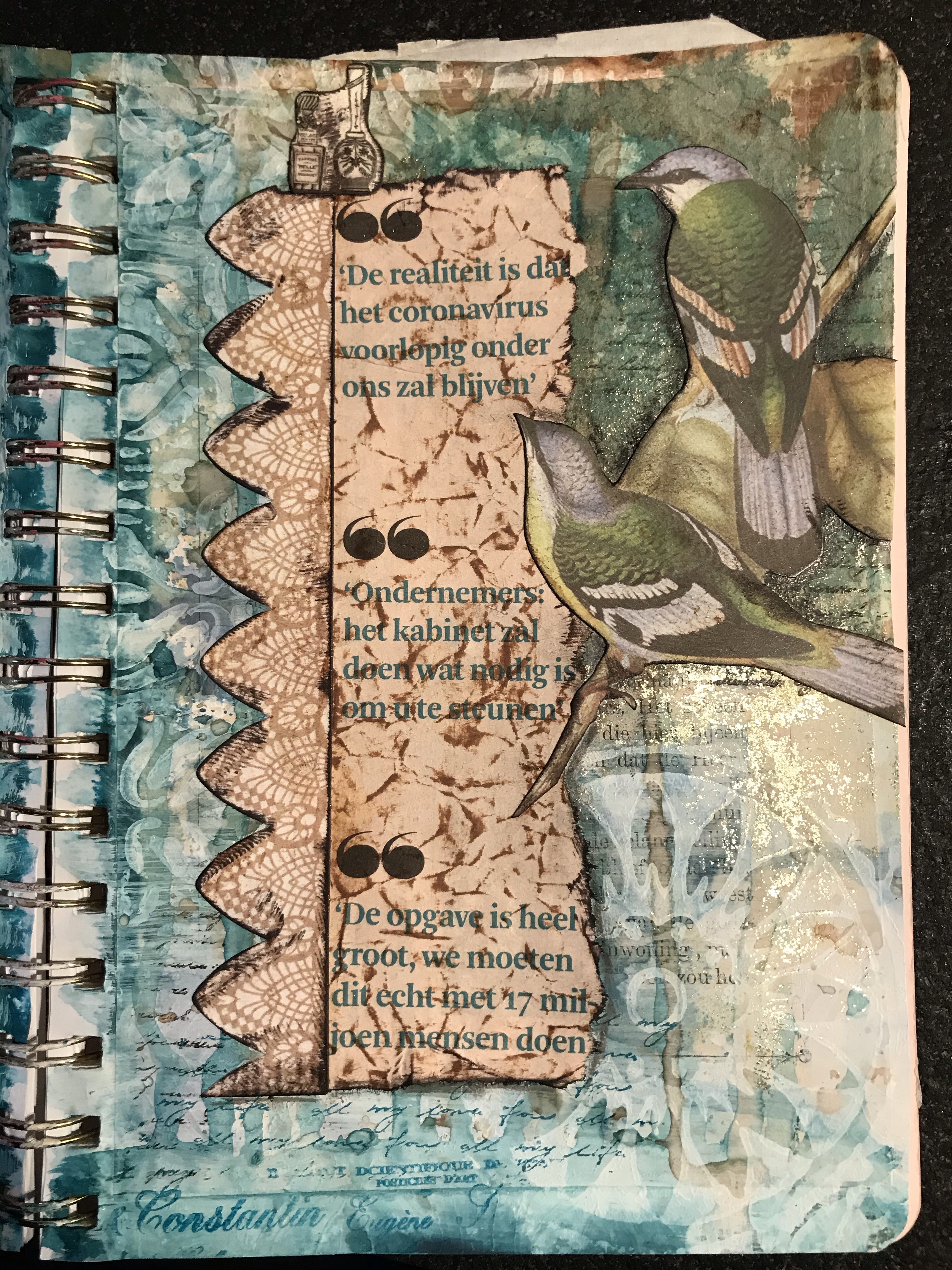 Ik had nog een krant liggen met uiteraard wat coronanieuws erin. De kleur van de letters inspireerden me om een blauw/groene achtergrond te maken. Ik heb hiervoor oude vellen scrappapier gebruikt (de vogels zijn daar uitgeknipt) en inkt van markeerstiften van de Hema (van die mooie blauwe kleurtjes!). Gestempeld met gesso en “vlekken” gemaakt met vintage inkt. Er zit ook nog een transfer op de linkerpagina, coronavirusjes, uit dezelfde krant. Als laatste nog clearstamps gebruikt voor details, in blauw en donkerbruin…