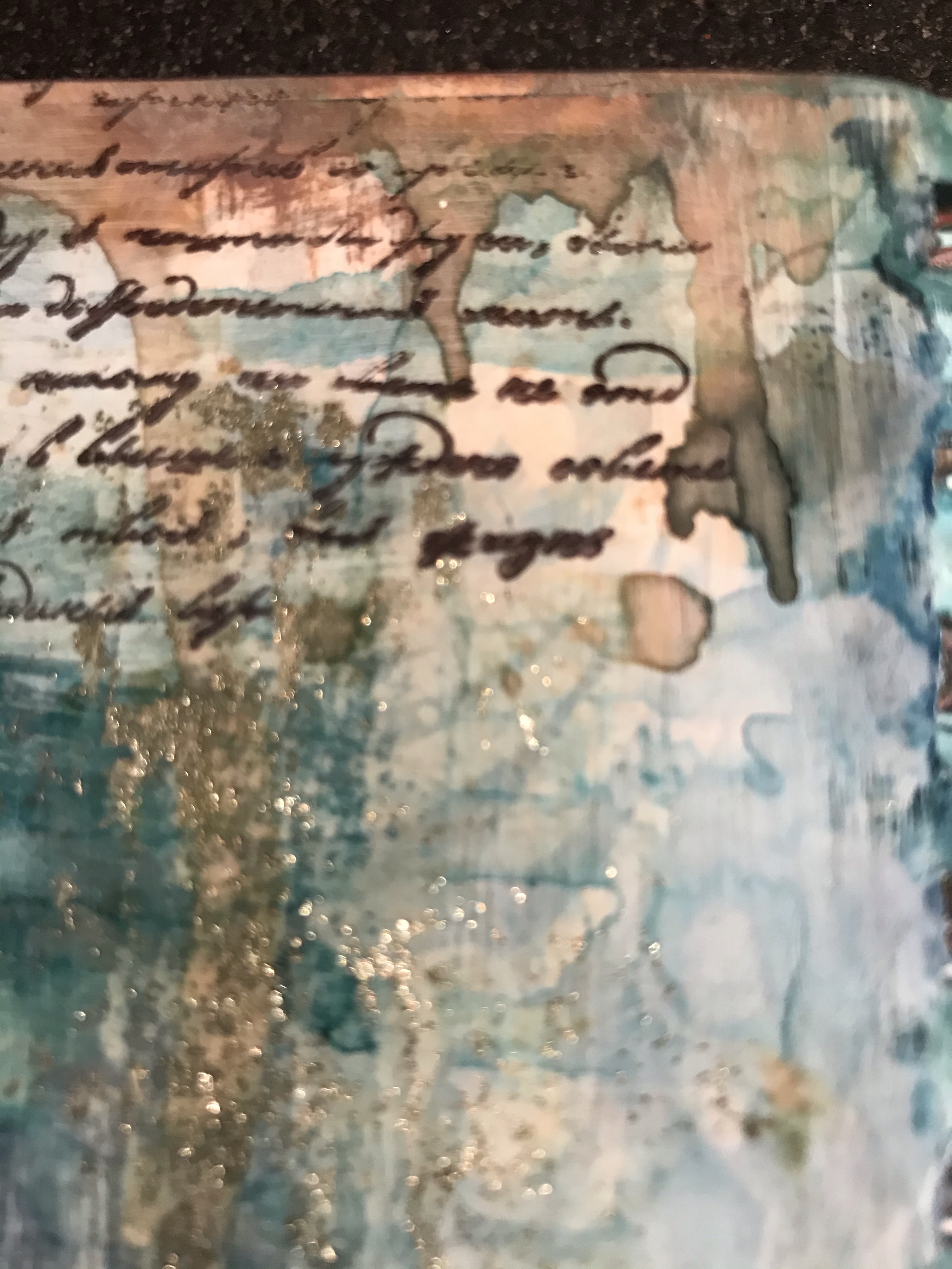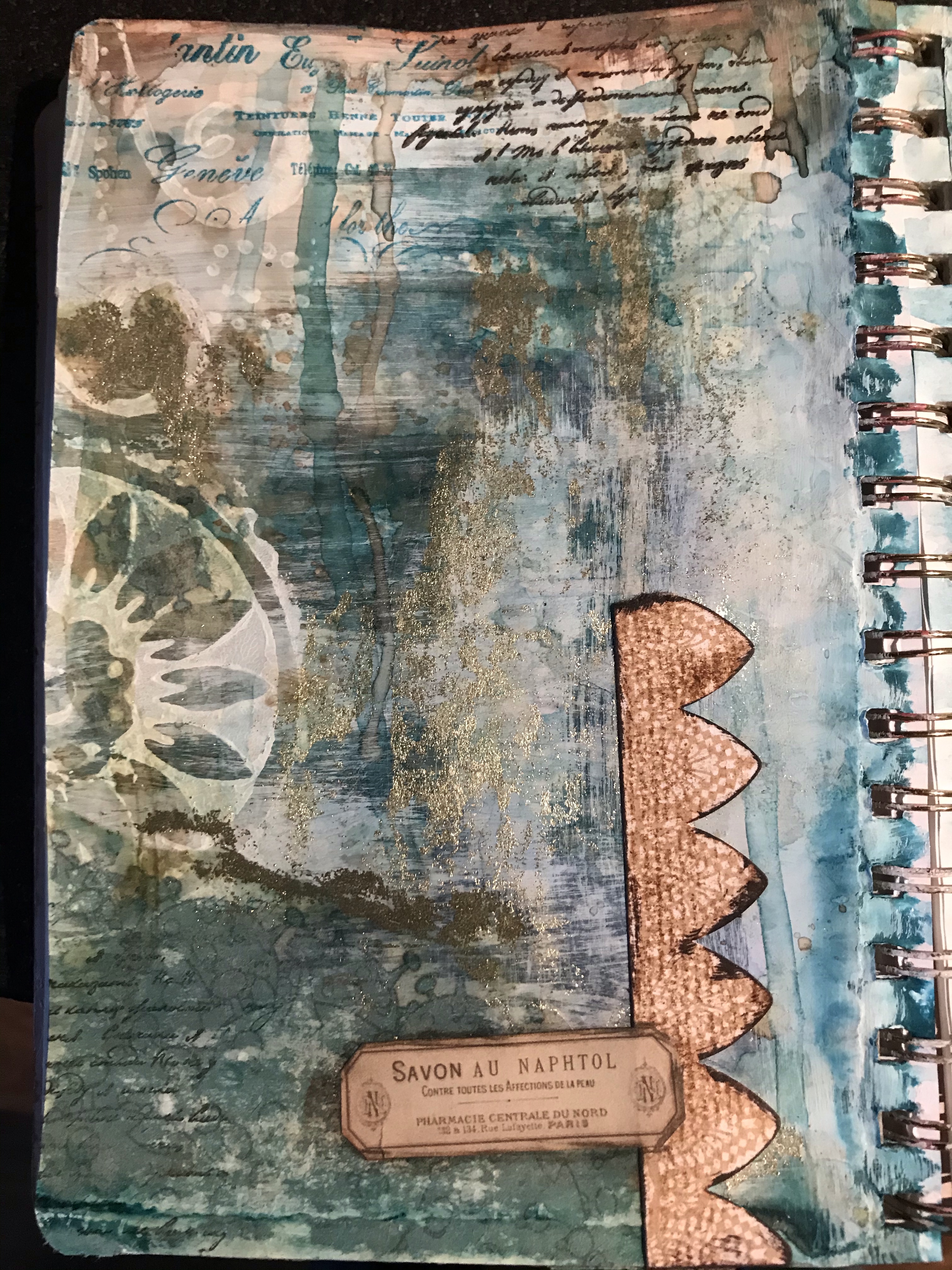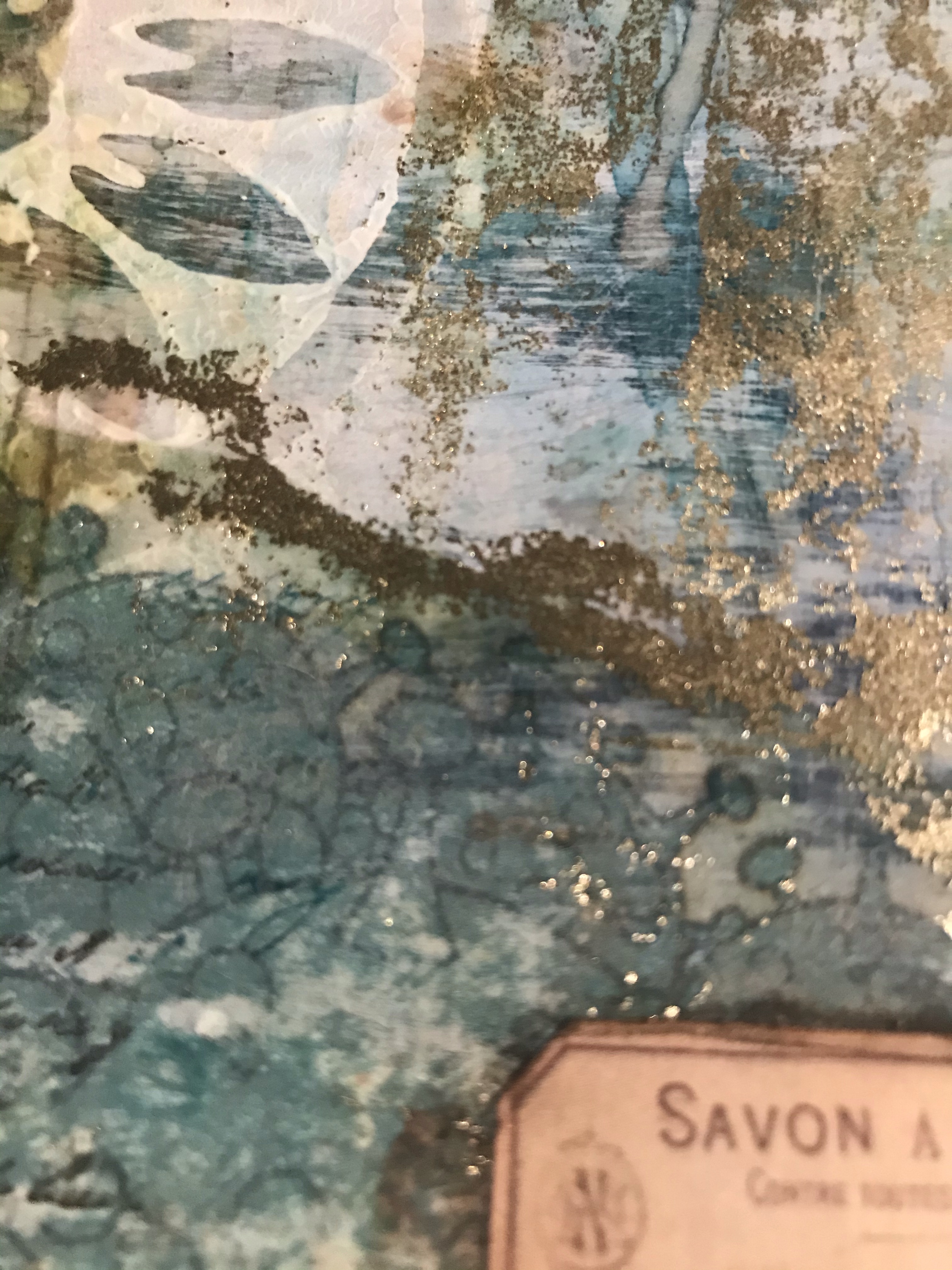 De gouden afwerking is gemaakt met papier uit thailand, dat wordt daar gebruikt om met overledenen mee te geven… ziet eruit als heel simpel papier met een gouden en zilveren deel…. de afdruk die ik ermee maak is lichtgoud (zowel van de zilveren kant als de gouden kant). Ik smeer wat gelmedium over de pagina en duw daar dan het papier in, als je het loshaalt, blijft de gouden laag achter….