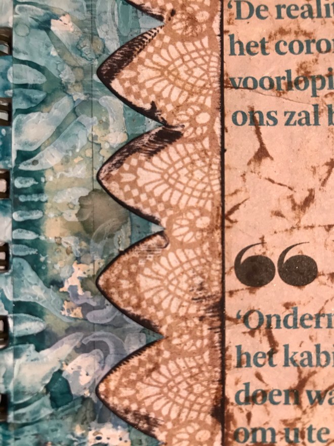 Ik had nog een krant liggen met uiteraard wat coronanieuws erin. De kleur van de letters inspireerden me om een blauw/groene achtergrond te maken. Ik heb hiervoor oude vellen scrappapier gebruikt (de vogels zijn daar uitgeknipt) en inkt van markeerstiften van de Hema (van die mooie blauwe kleurtjes!). Gestempeld met gesso en “vlekken” gemaakt met vintage inkt. Er zit ook nog een transfer op de linkerpagina, coronavirusjes, uit dezelfde krant. Als laatste nog clearstamps gebruikt voor details, in blauw en donkerbruin…