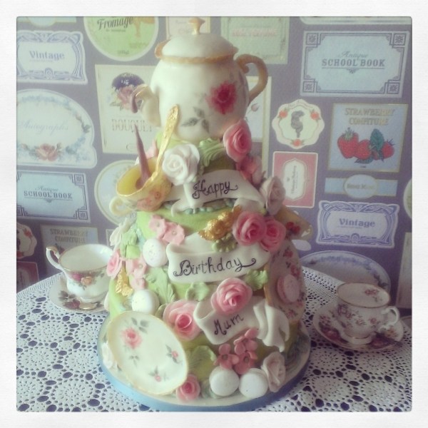 Dat zijn dus best veel uurtjes…. de hele taart is dan ook geverfd, voorzien van goudverf en hier en daar een spikkel bladgoud…. en daar zit dus nog niet het bakken, vullen en afsmeren bij, want dan had ik de avond ervoor gedaan. En de kopjes en schoteltjes lagen ook al klaar….. 😉