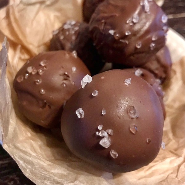 Smelt wat melkchocoladecallets au bain marie, rol de balletjes door de gesmolten chocolade en bestrooi met zout.