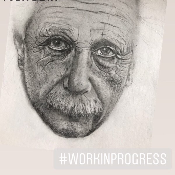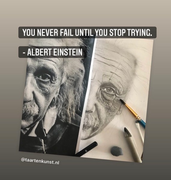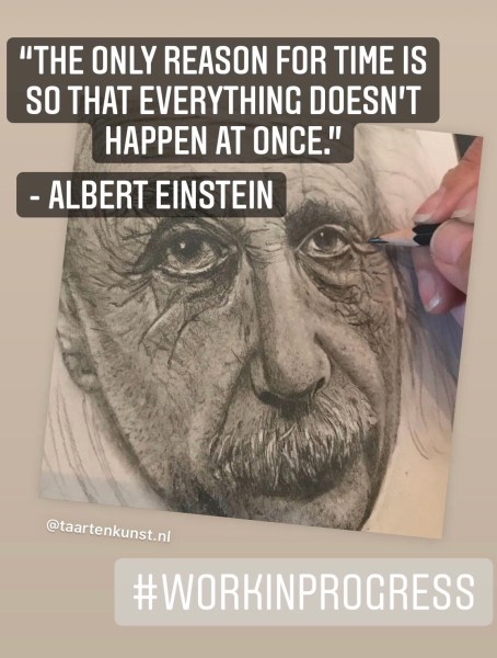 Mr TAARTenkUNST stelde voor om als volgende portret te kiezen voor Einstein. Leuk, want ik wil nog een heleboel markante koppen tekenen. Ik heb er echt lol in maar vind dat ik nog heel wat te oefenen heb. Ik vind een donkere achtergrond eigenlijk ook wel een uitdaging.
