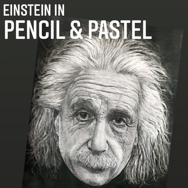 Mr TAARTenkUNST stelde voor om als volgende portret te kiezen voor Einstein. Leuk, want ik wil nog een heleboel markante koppen tekenen. Ik heb er echt lol in maar vind dat ik nog heel wat te oefenen heb. Ik vind een donkere achtergrond eigenlijk ook wel een uitdaging.