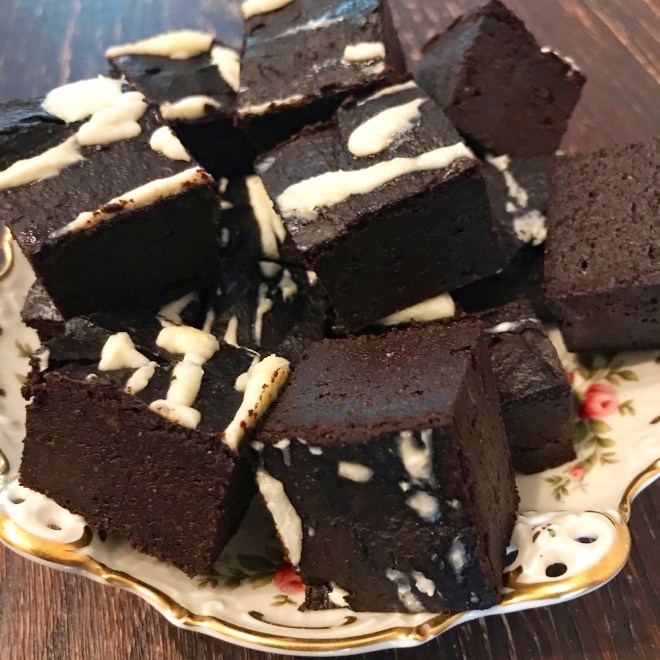 | VOOR DE TOPPING: 150 gr witte chocolade callets (ik gebruik het merk Xucker van Lowcarbcenter) 1 el roomboter Verwarm in een steelpannetje langzaam de witte chocola en roomboter en roer door totdat er een egale massa ontstaat. Laat dit iets afkoelen en verdeel het over de bovenkant van de afgekoelde brownie. |