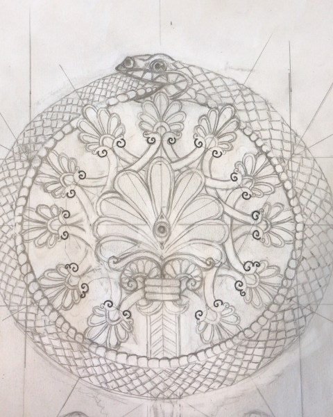 Het slangenvel is wat minder “echt”, ik heb er een soort grieks motiefje van gemaakt, gebaseerd op de bekende meander, dat ook weer oneindigheid voorstelt, net als de Ouroboros.
