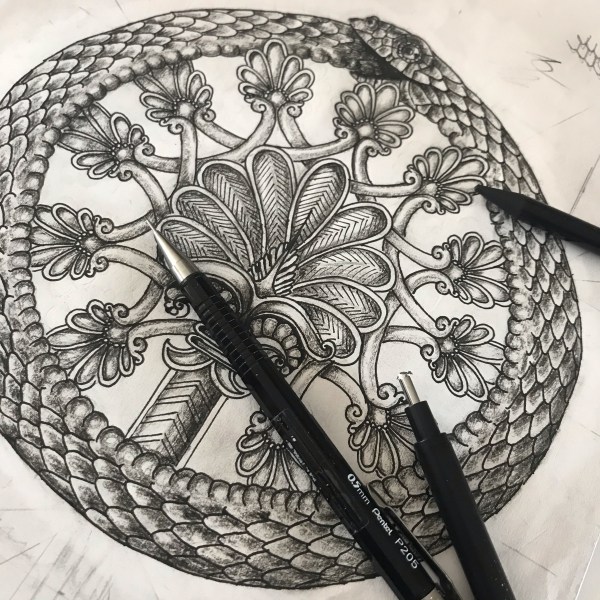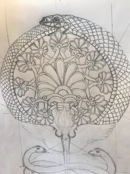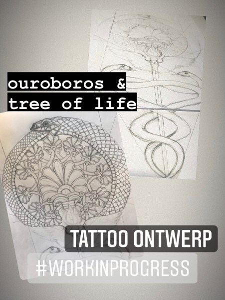 Mr TAARTenkUNST kwam met een verzoekje….. of ik een tattoo ontwerp kon maken met een Assyrische levensboom en een Ouroboros. De levensboom is langwerpig, maar of ik dat dan rond kon maken. Natuurlijk kan dat.